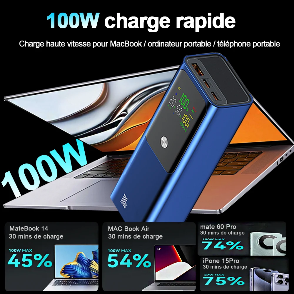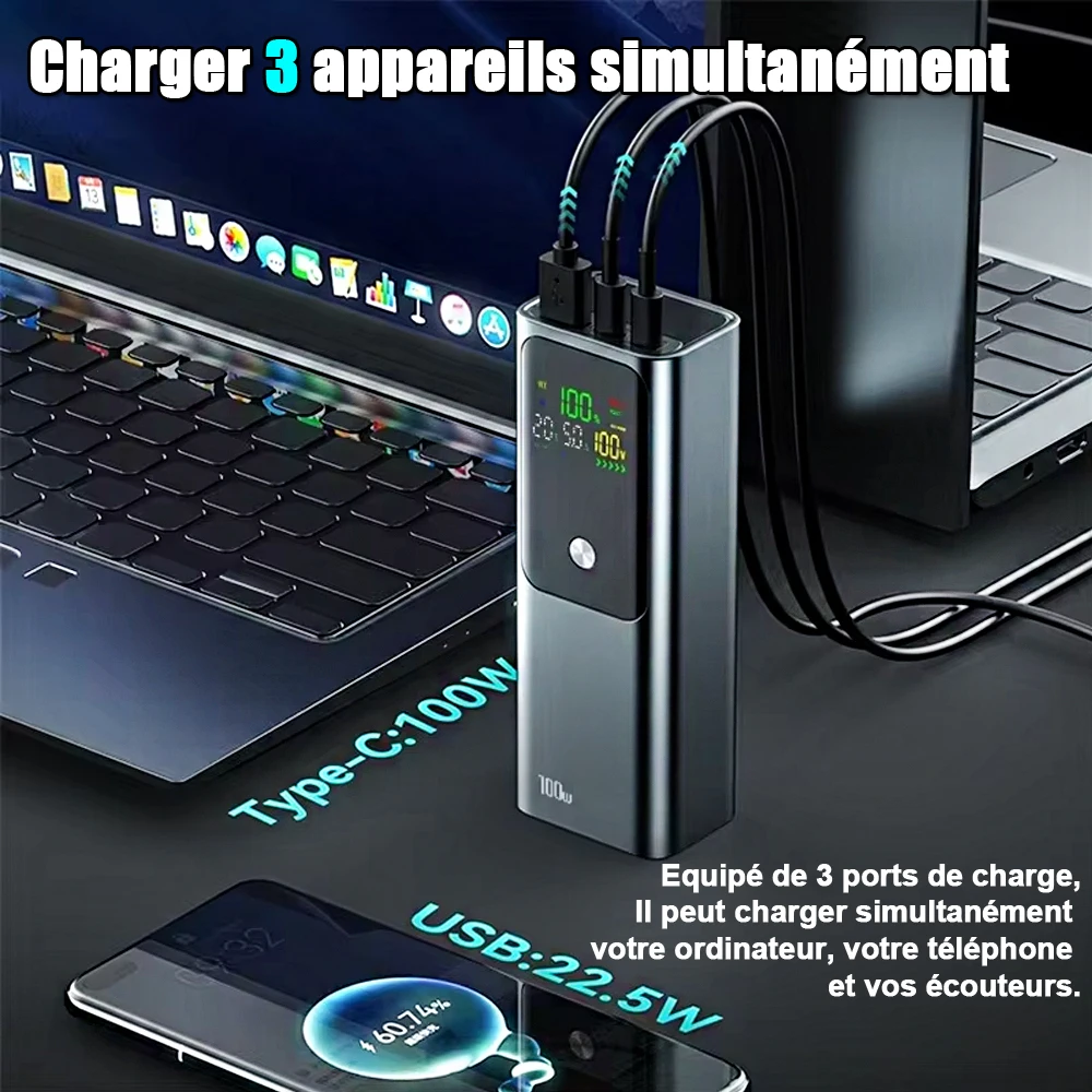 La banque d'alimentation mobile prend en charge une sortie maximale PD 100 W Batterie à charge rapide de 100 W, prenant en charge la charge rapide pour différents appareils.