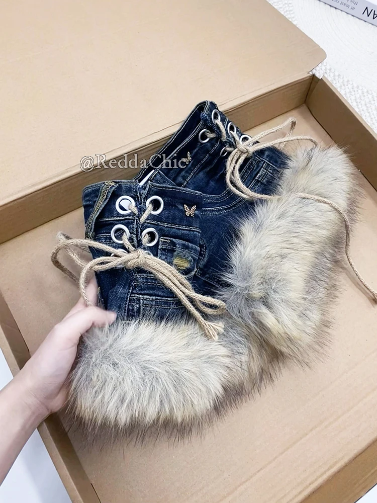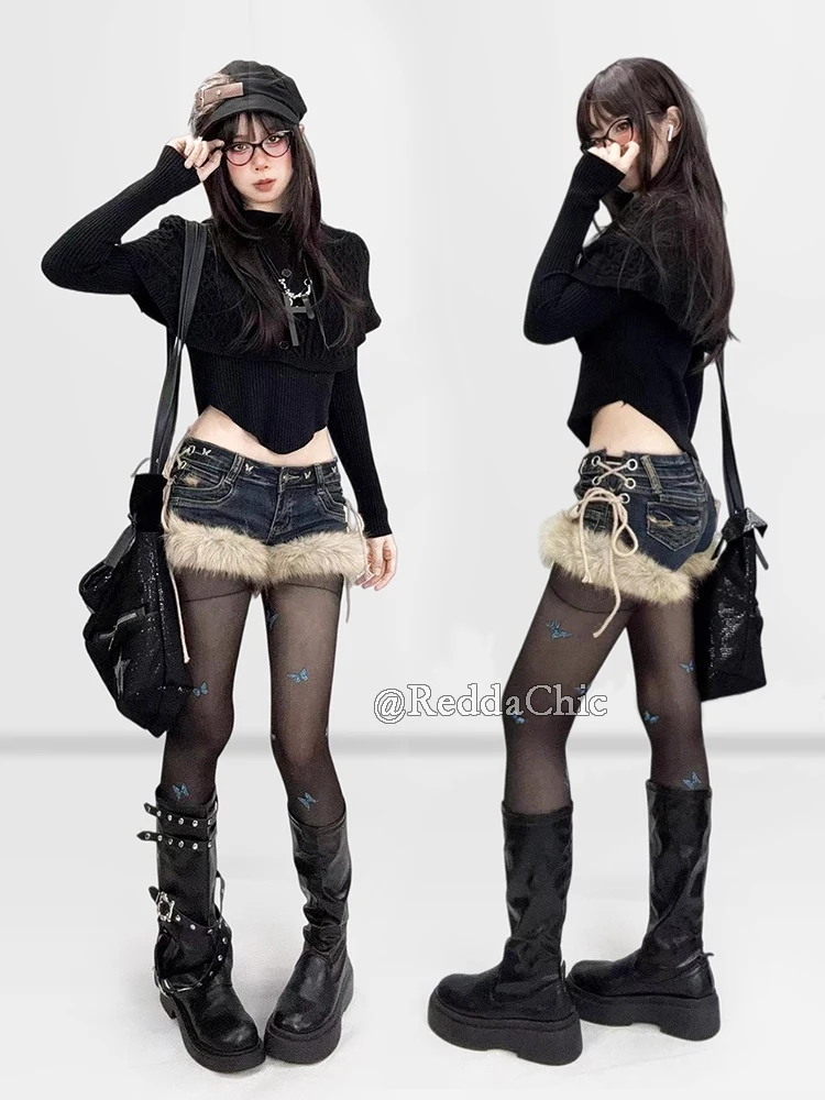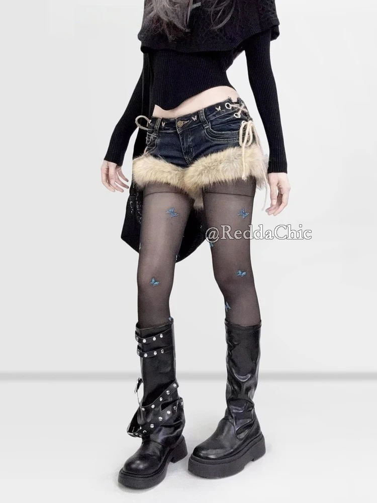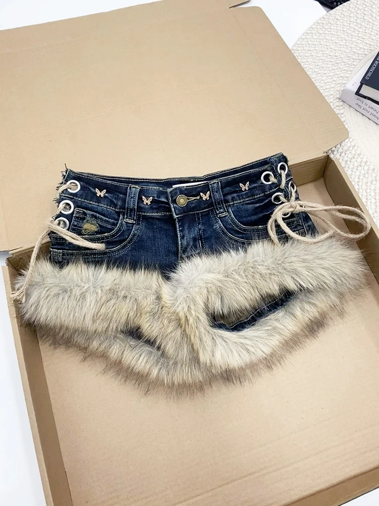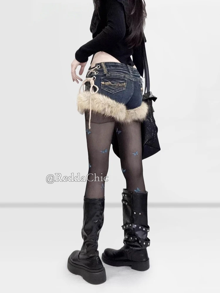 REDDACHiC Gyaru Y2k taille basse Jean Shorts à la mode papillon Rivets creux à lacets poignets en fourrure Denim Shorts rétro chaud femmes bas
