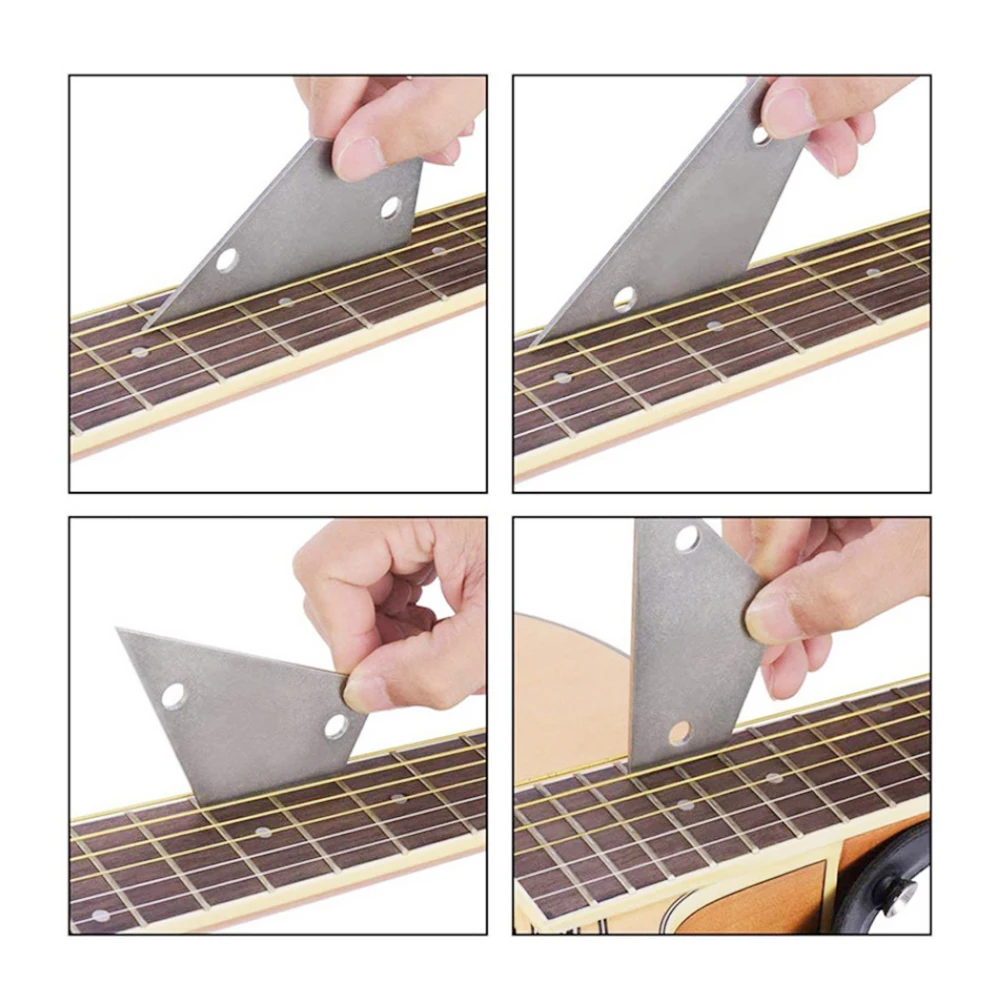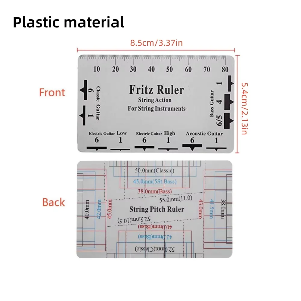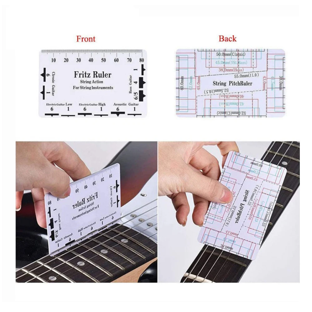 3.Utilisations larges : la règle d'action des cordes aide à mesurer la fente du pont, la hauteur de la corde, de l'écrou et de la tige de micro, même la profondeur de la fente du frette ;La règle à bord droit cranté aide à vérifier si chaque touche est au même niveau, le bascule de frette peut s'étendre sur 3 frettes et peut vérifier si les frettes sont au même niveau.