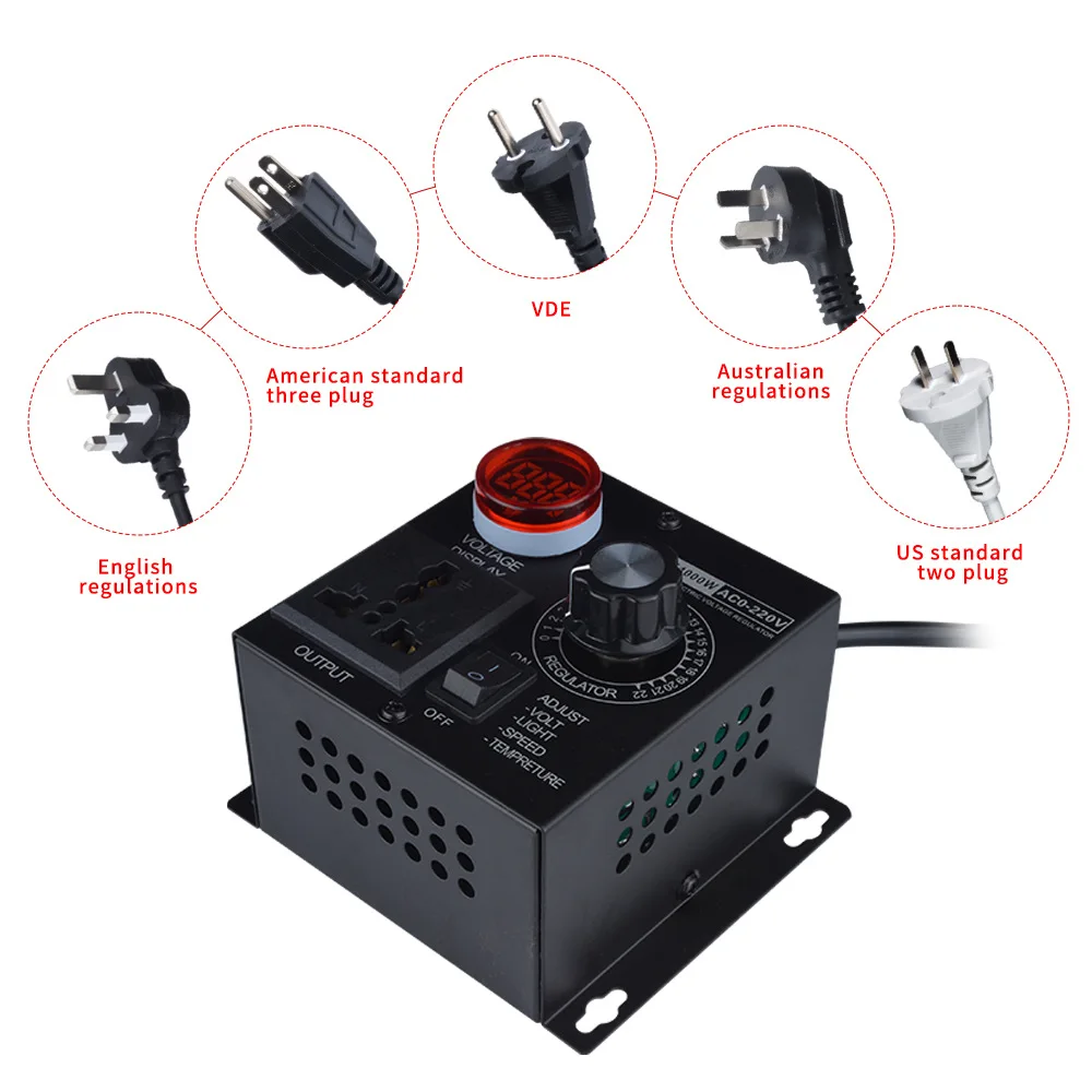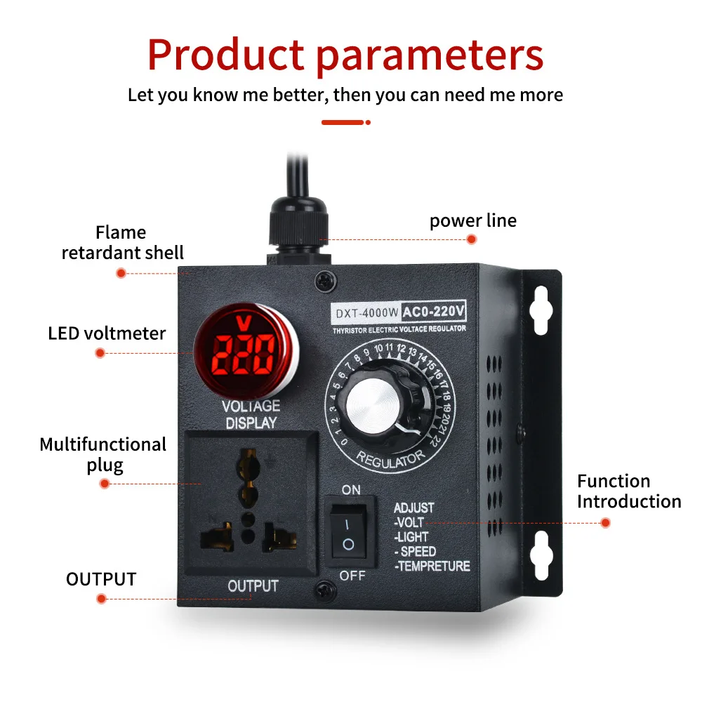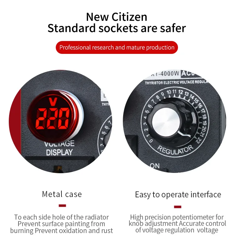 Réglage continu de la tension 2,0-220 V : réglage fluide du bouton, tension de sortie réglable en continu de 0 V à 220 V, contrôle précis de la puissance de l'équipement.