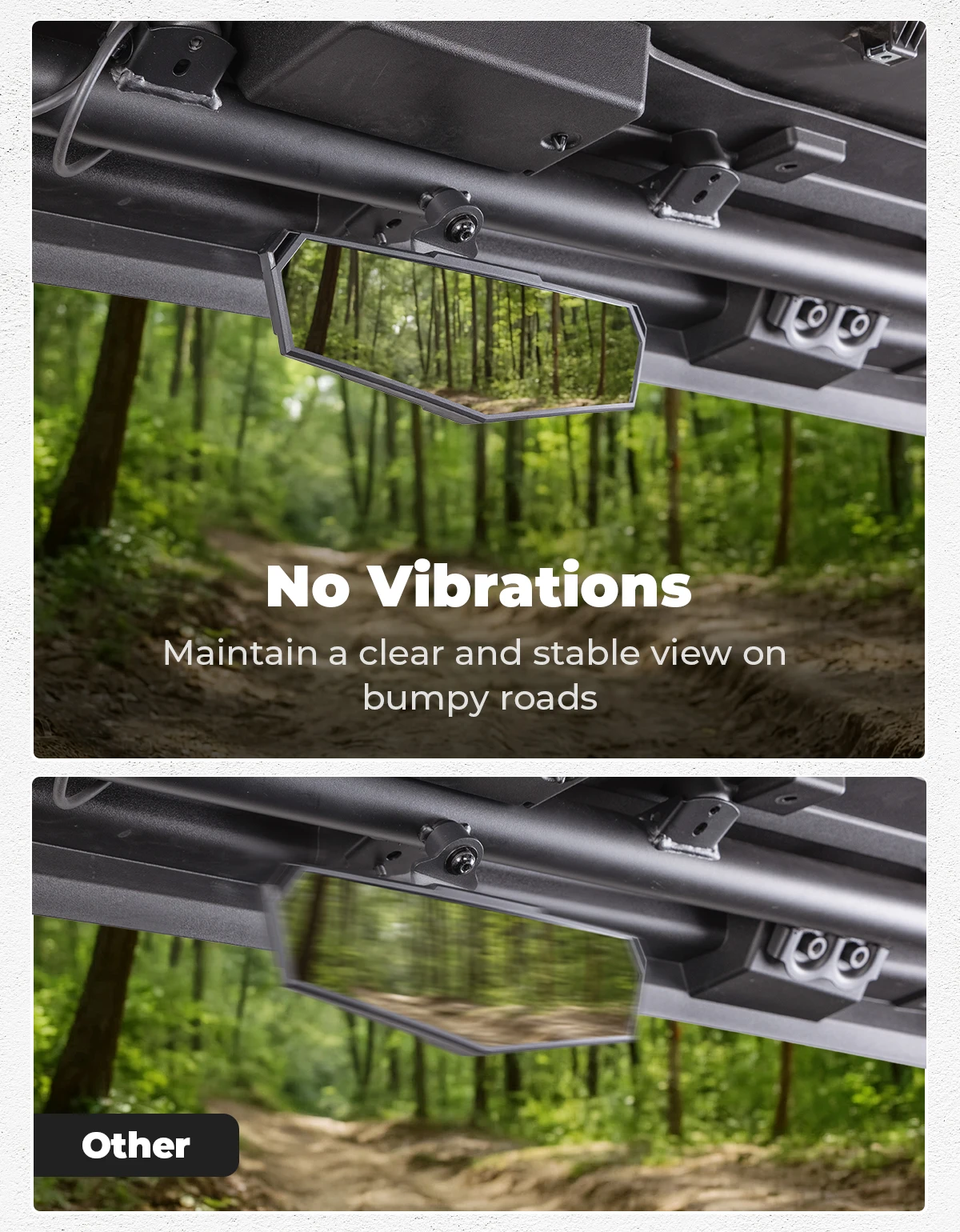 * Stable et anti-vibrations : La construction robuste maintient le rétroviseur stable même sur des terrains accidentés, offrant une vue arrière claire et stable sans desserrage ni déplacement.