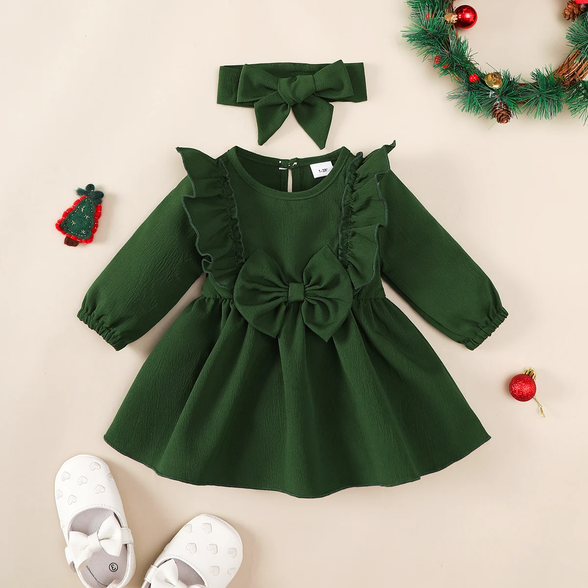 Robe d'automne pour bébé fille, bords et nœud à volants, robe à manches longues + bandeau pour 0-18 mois, Costume de fête de vacances mignon pour bébé fille