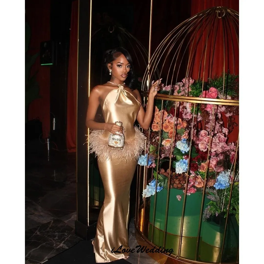 Robe de bal en plumes Golden Haler, en Satin, élégante, robe de soirée de mariage, style sirène, sans manches, longueur au sol, personnalisée, 2025