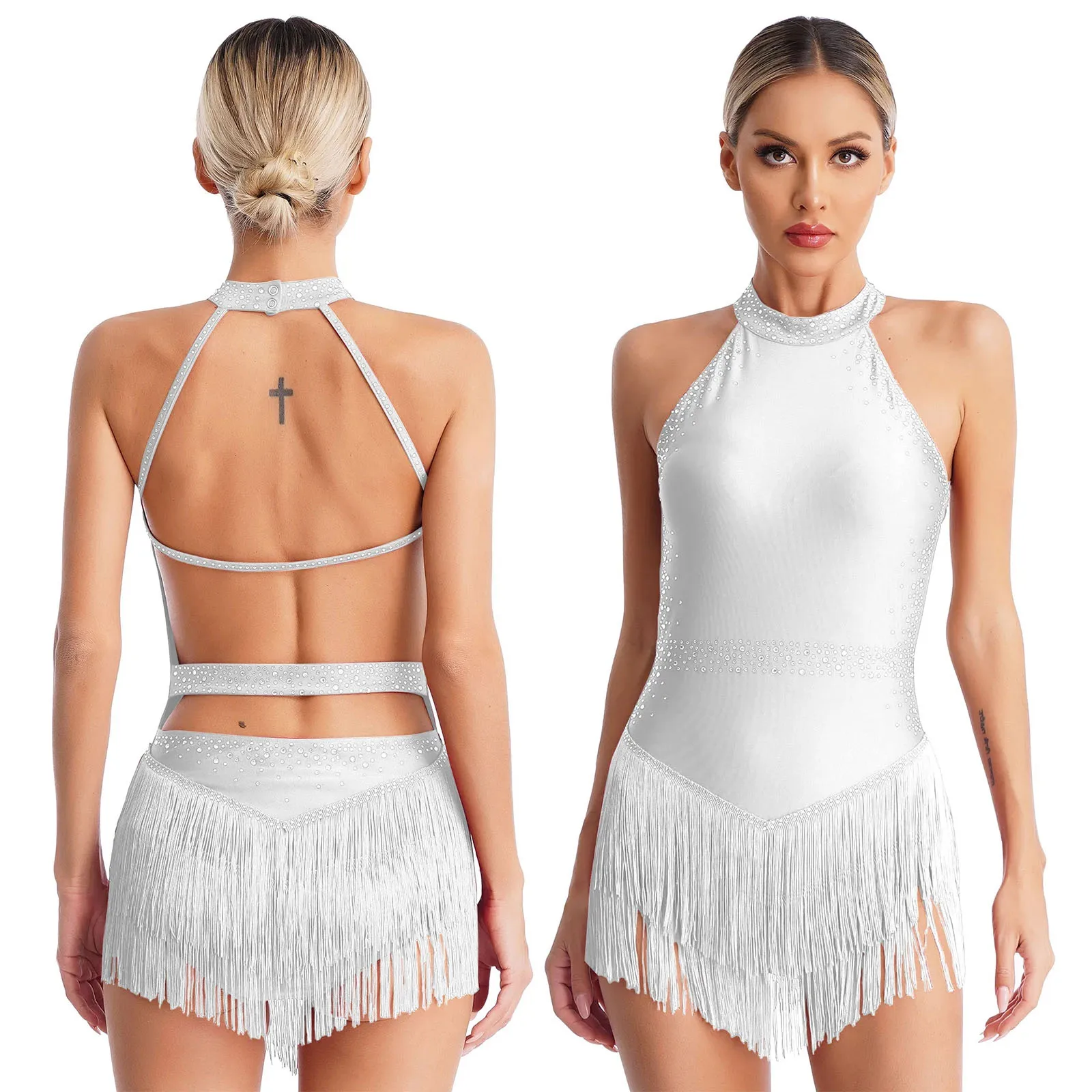 Robe justaucorps de danse latine Jazz pour femmes, strass scintillants, bretelles réglables, body à franges découpé avec gants