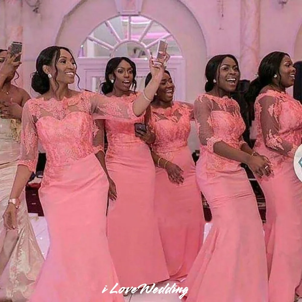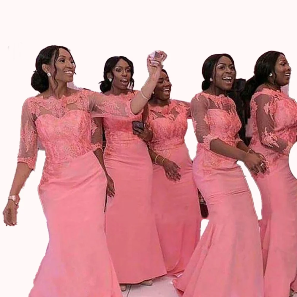 Robe de demoiselle d'honneur en Satin rose, manches mi-longues, style sirène, longueur au sol, robe d'invitées de mariage, personnalisée