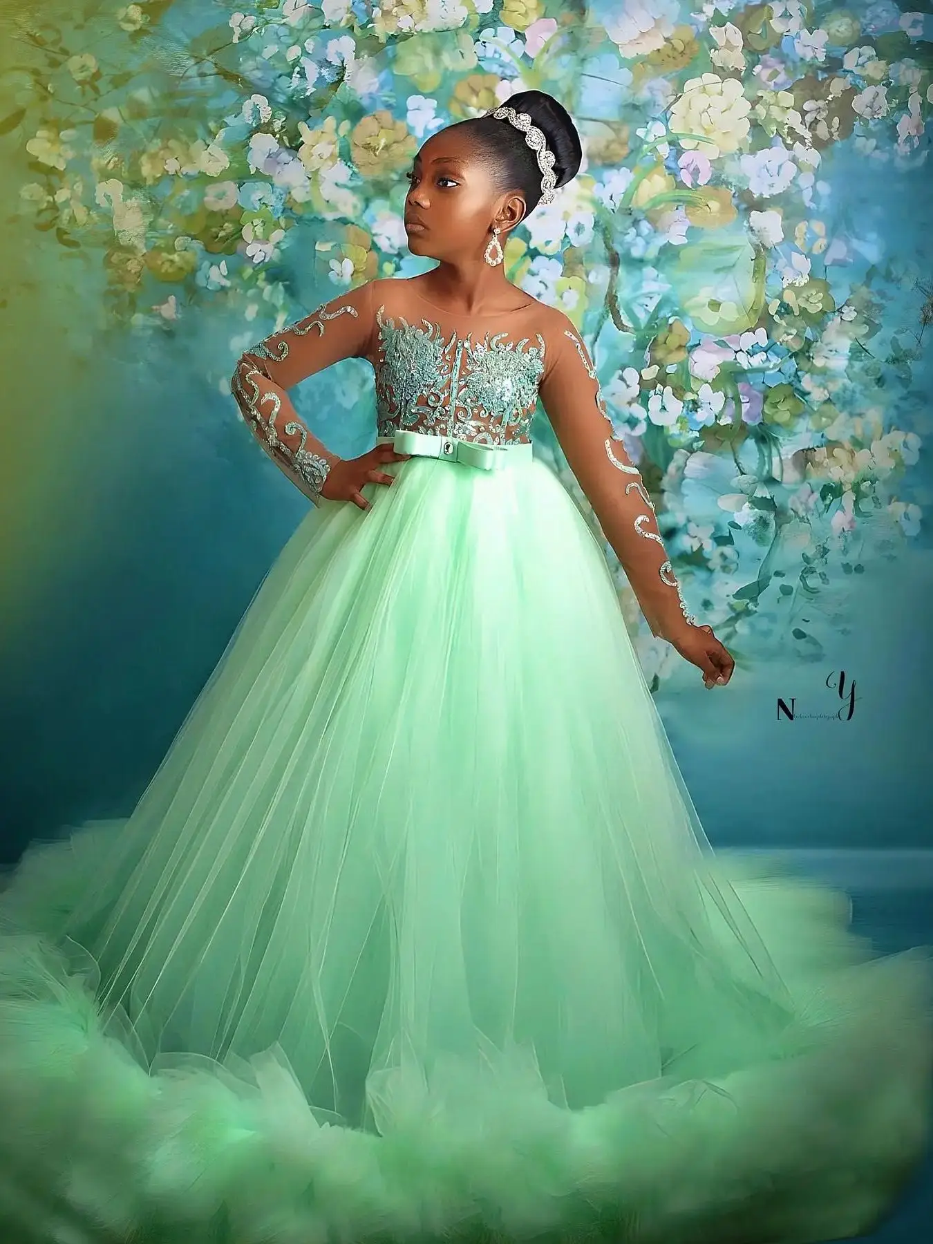 Robe de reconstitution historique à manches longues perlées personnalisées pour enfants, robe bouffante, volants à plusieurs niveaux, robe de séance photo, robe d'anniversaire pour filles, vert élégant