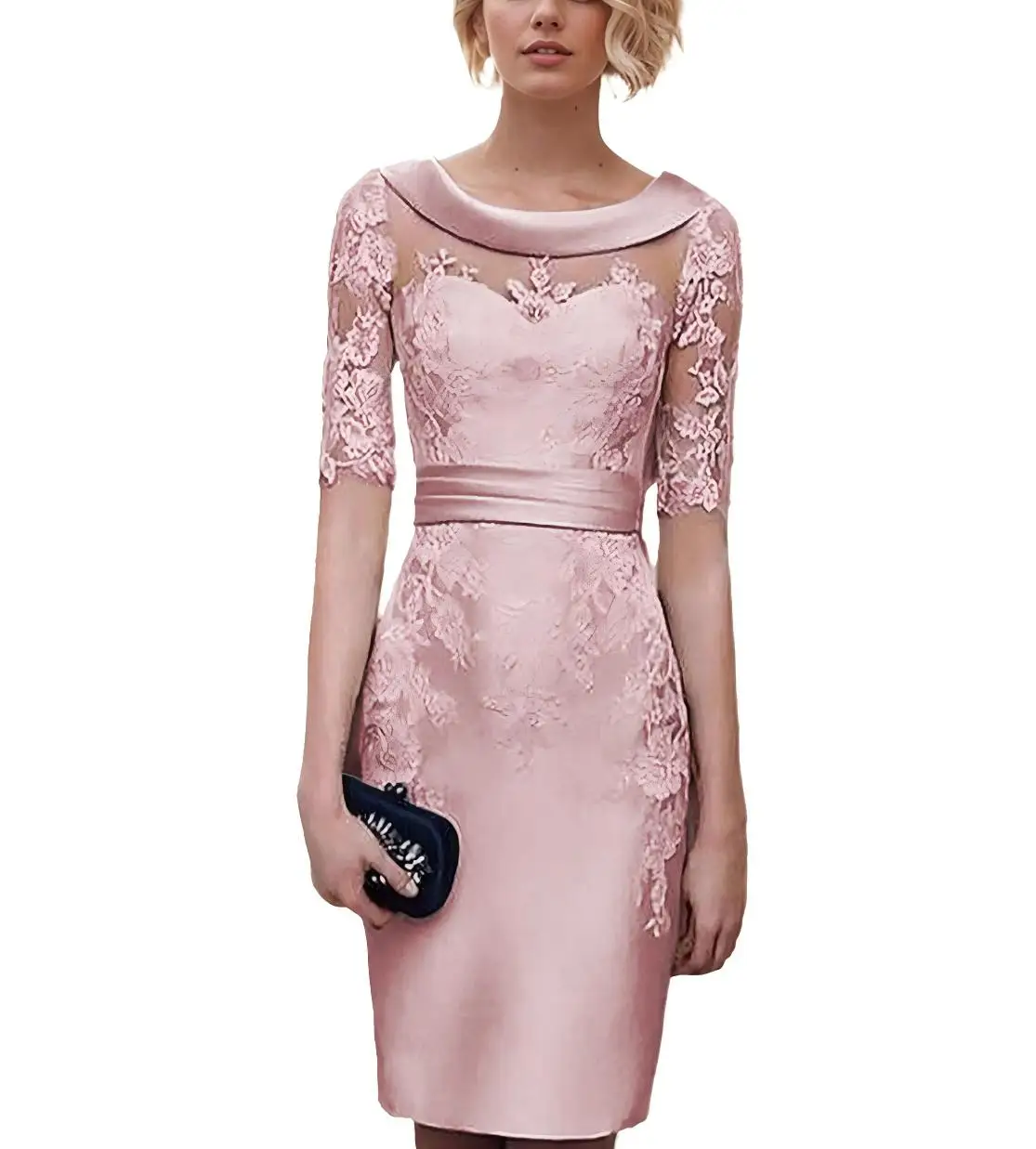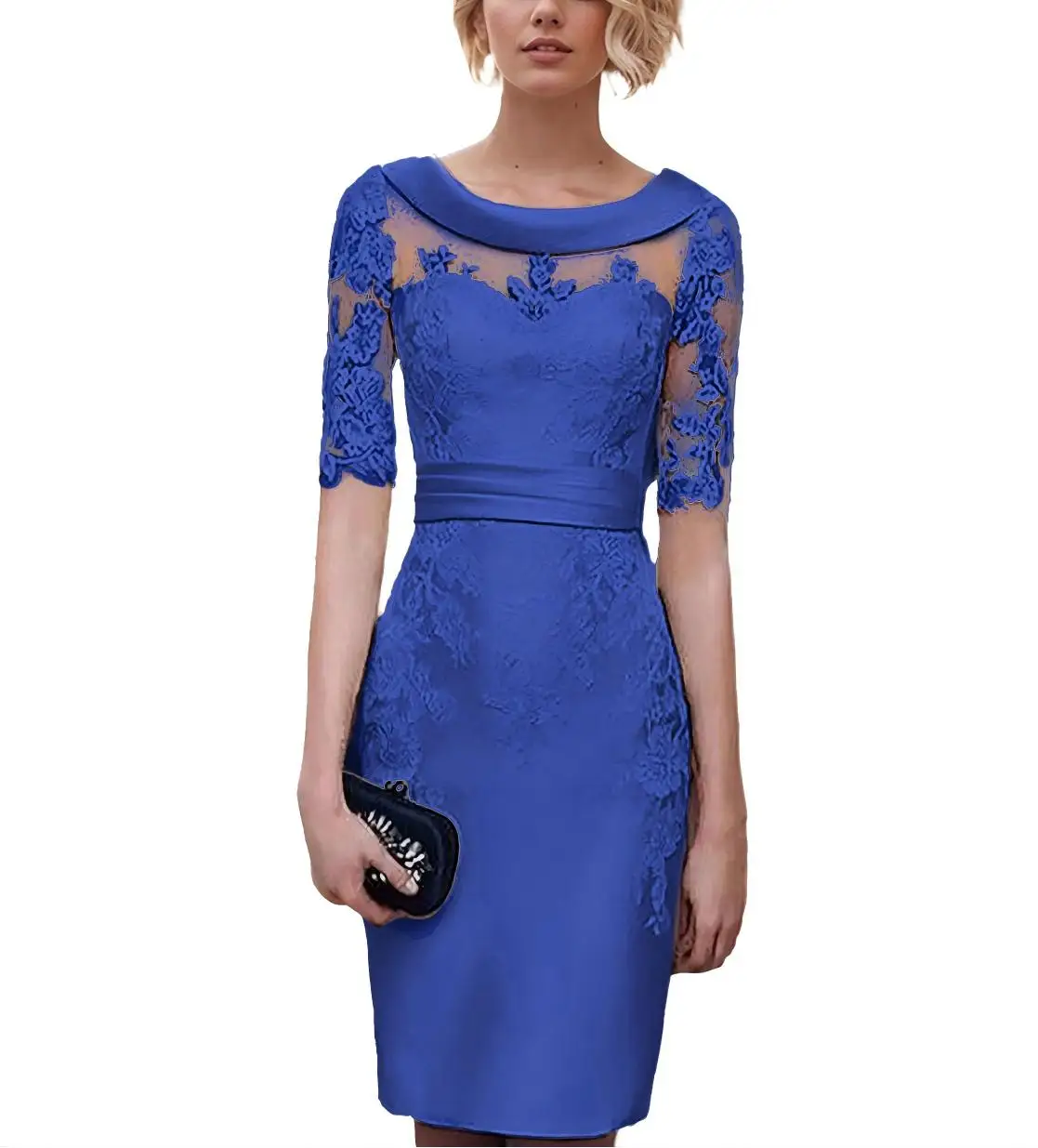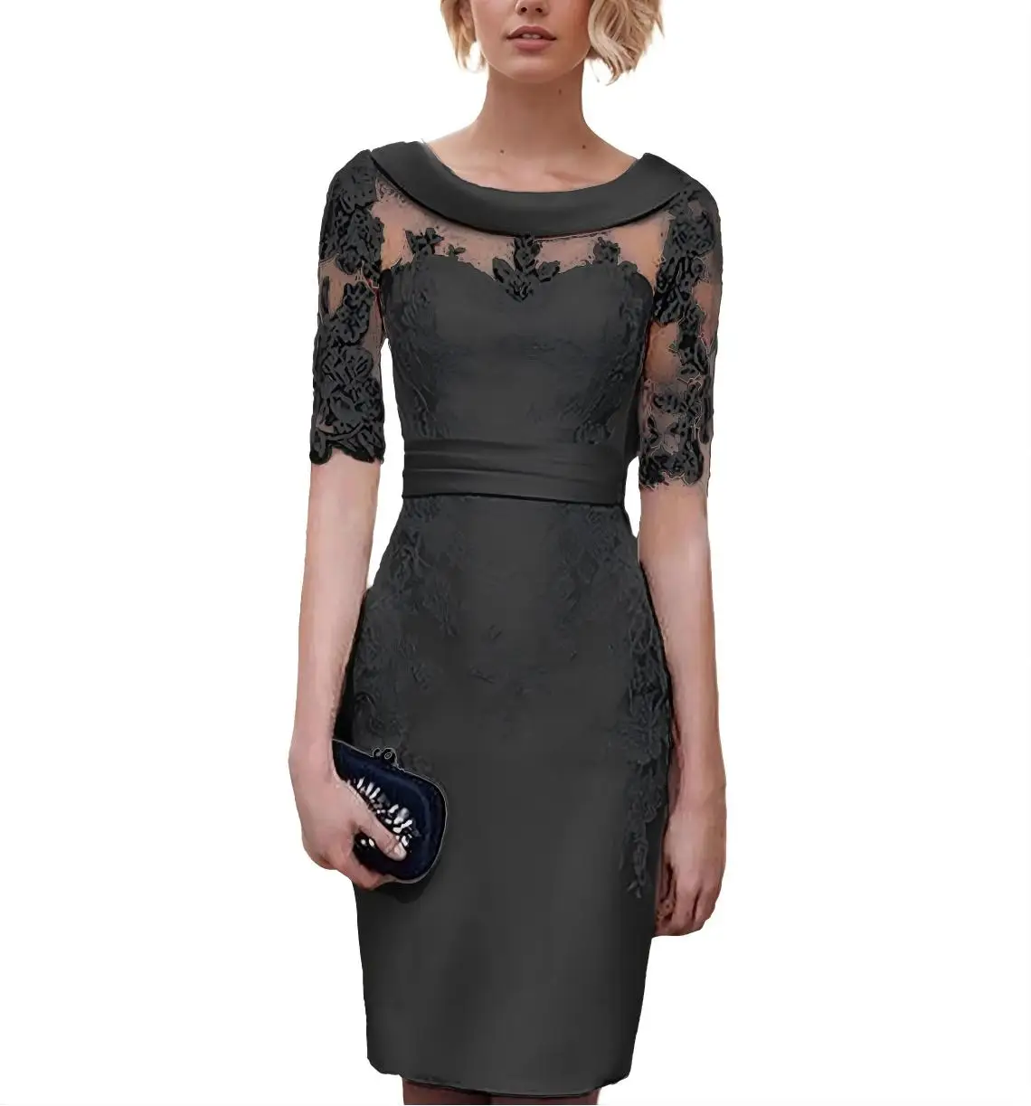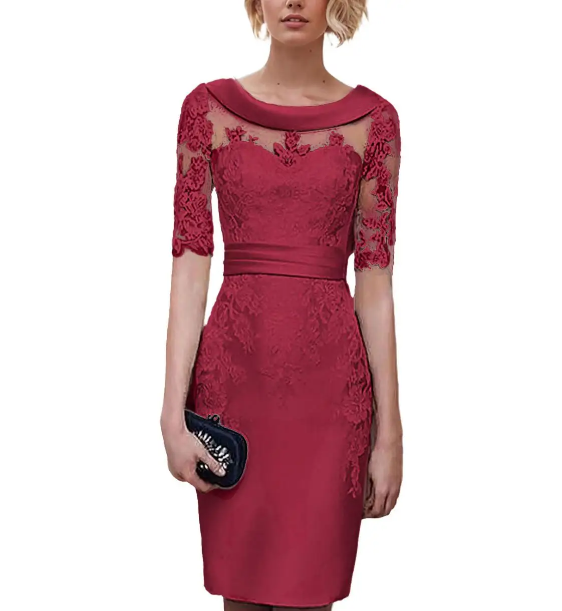Cette robe de soirée en dentelle à col bateau, gaine classique, longueur aux genoux, demi-manches, robe d'invité de mariage en Satin