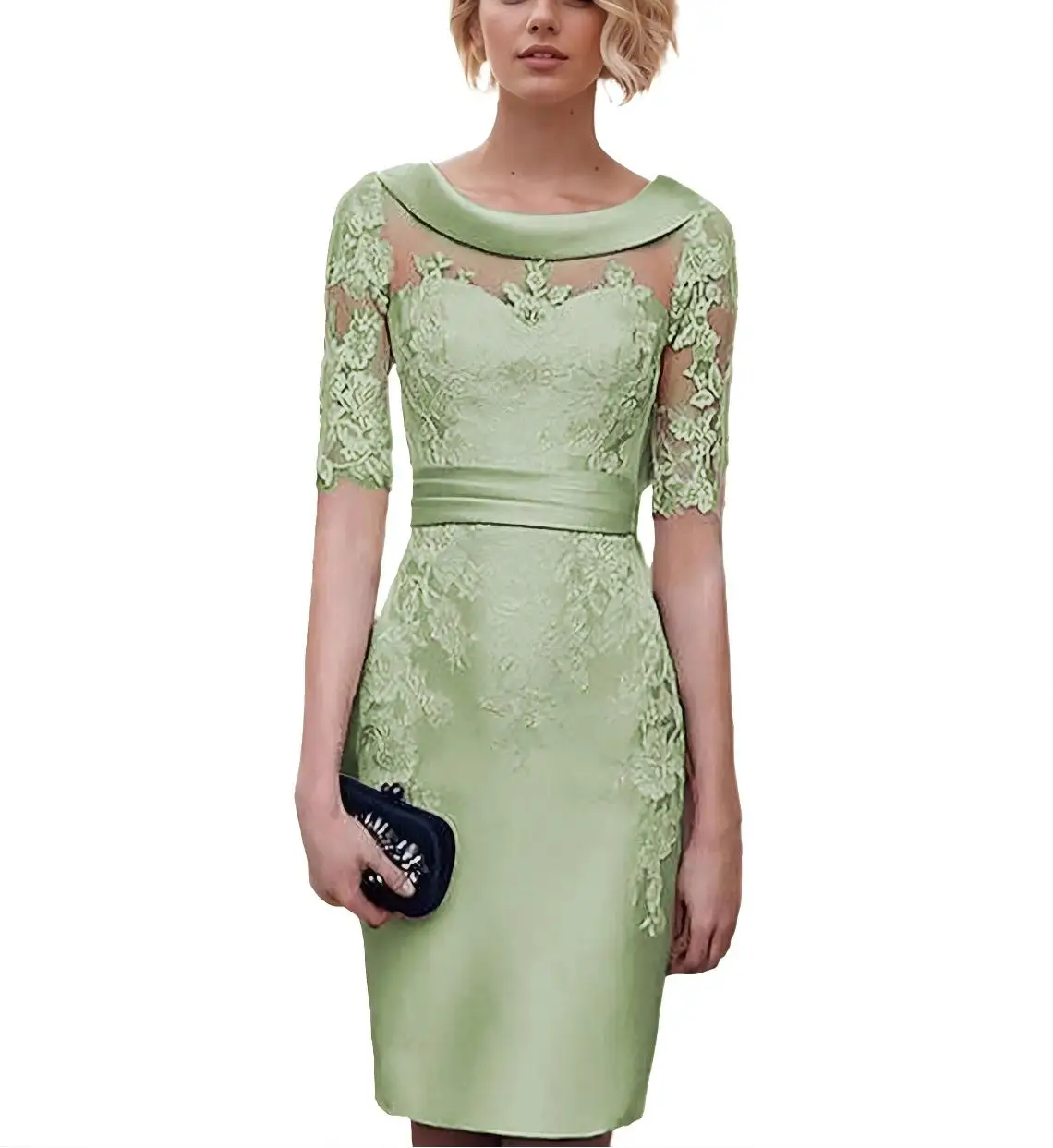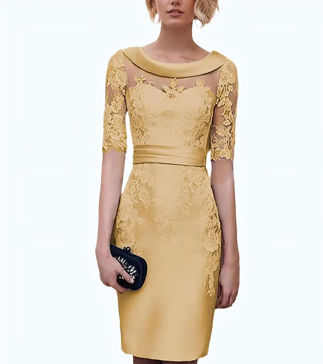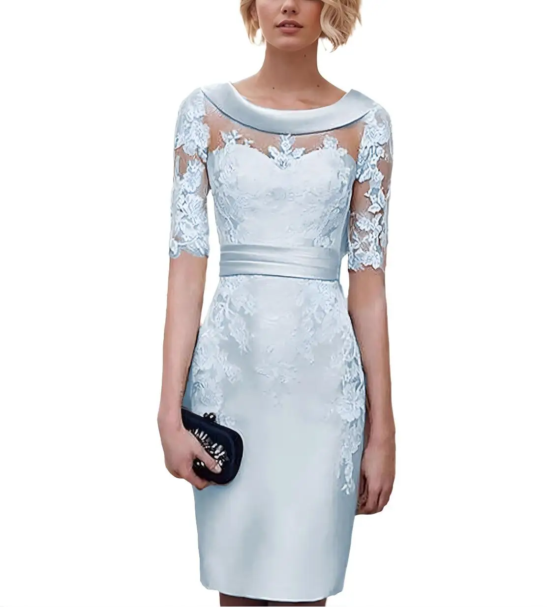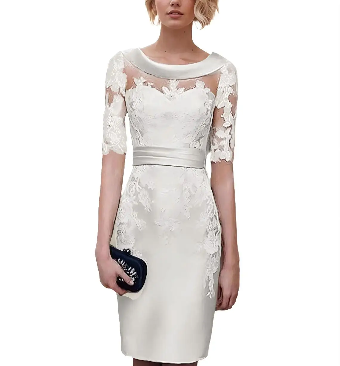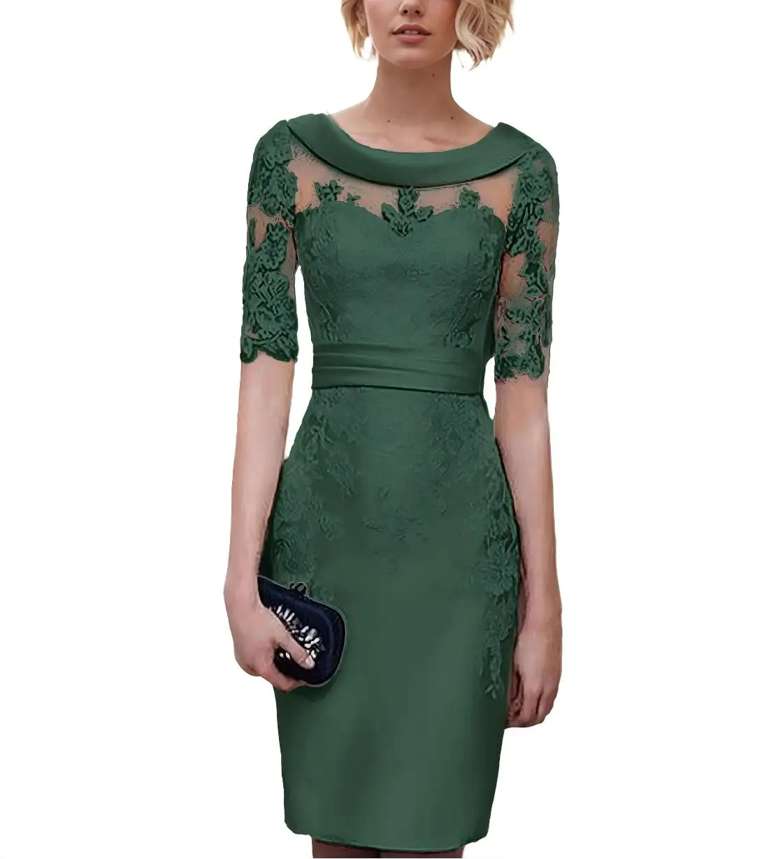 Cette robe de soirée en dentelle à col bateau, gaine classique, longueur aux genoux, demi-manches, robe d'invité de mariage en Satin