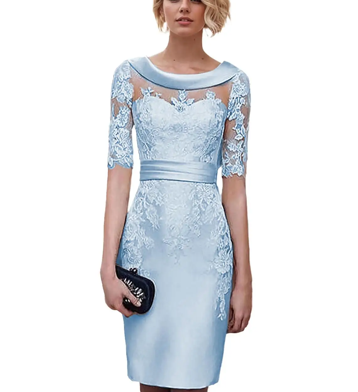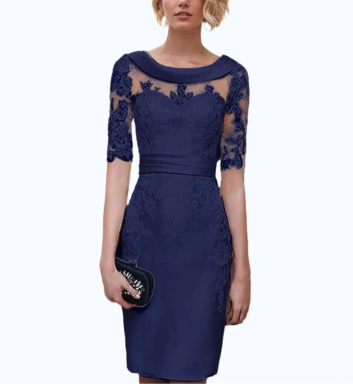 ❤Présentation du produit de cette robe d'invité de mariage en dentelle à col bateau classique et de haute qualité, gaine élégante, longueur aux genoux, demi-manches, robe formelle en satin avec appliques