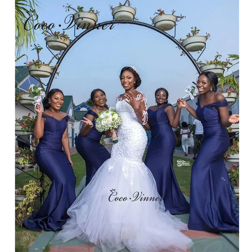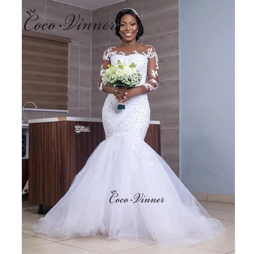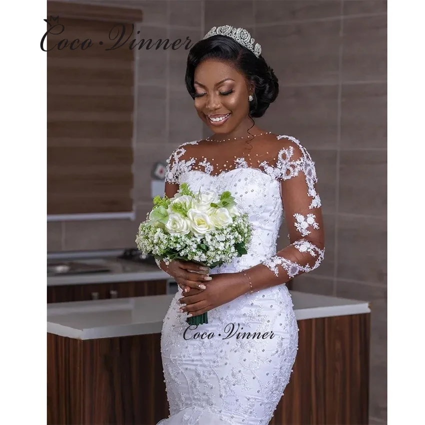 Robes de mariée sirène africaines avec appliques en dentelle personnalisées, cristal et perle perlée, manches Icidal, robe de mariée en tulle, W1377, 2025