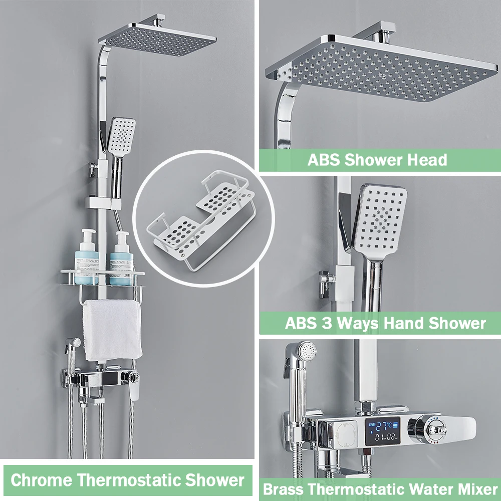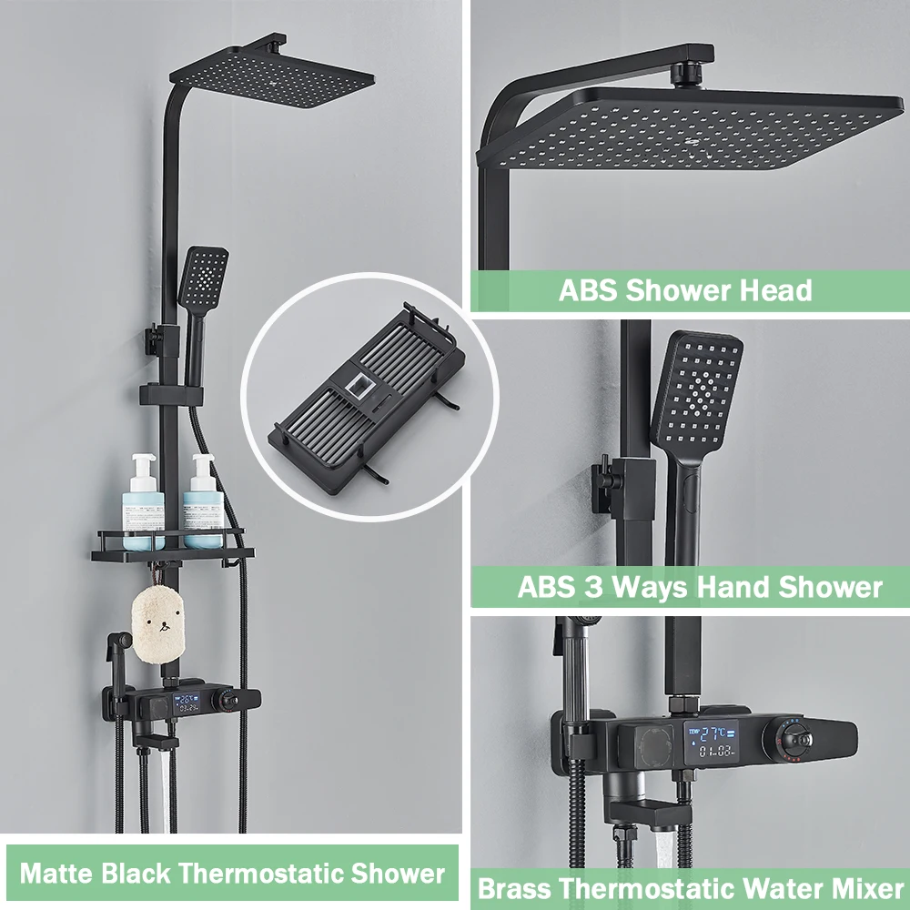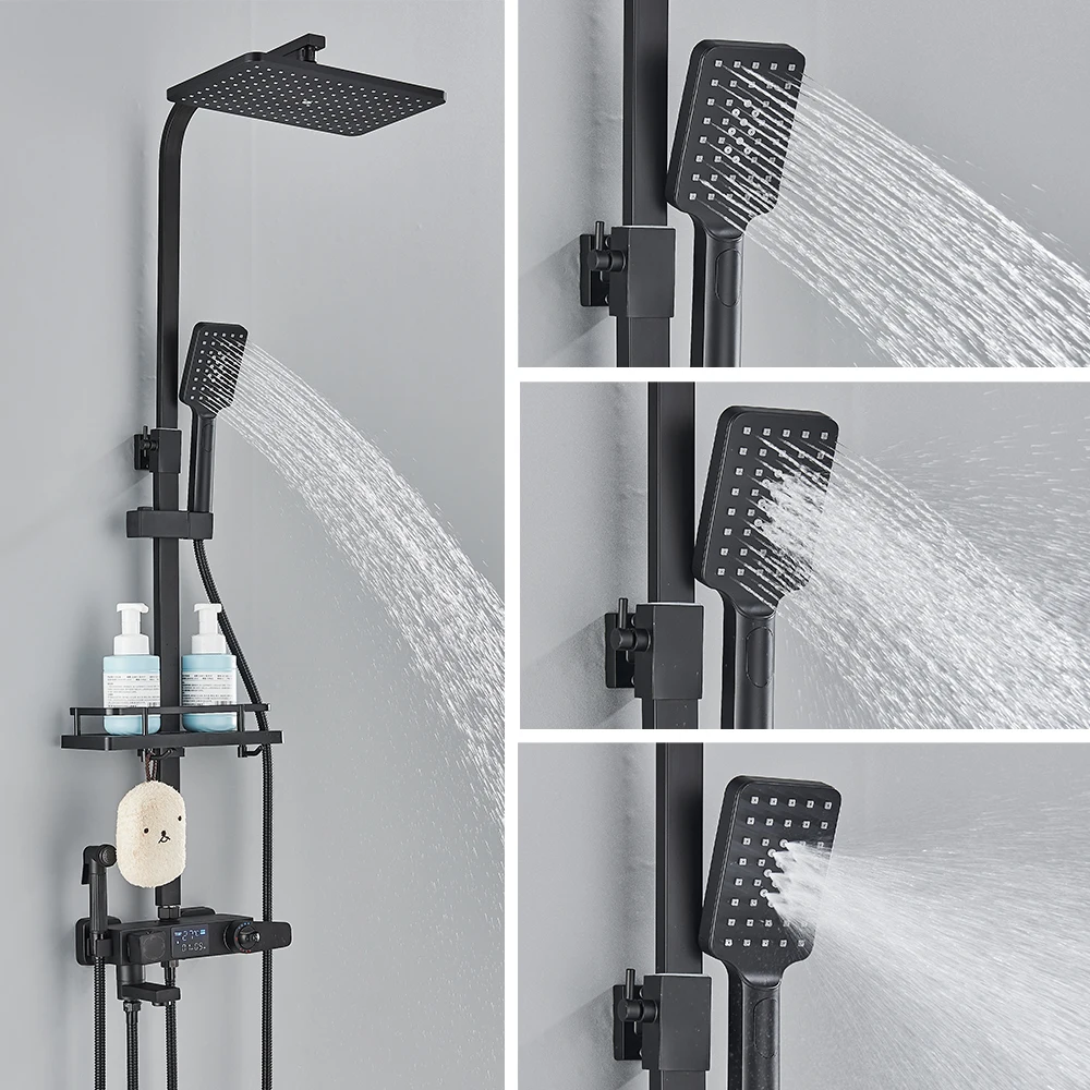 Robinet de douche thermostatique à affichage numérique noir, salle de bains, mitigeur de douche à pluie thermostatique à 4 voies, robinets, étagère et Bidet