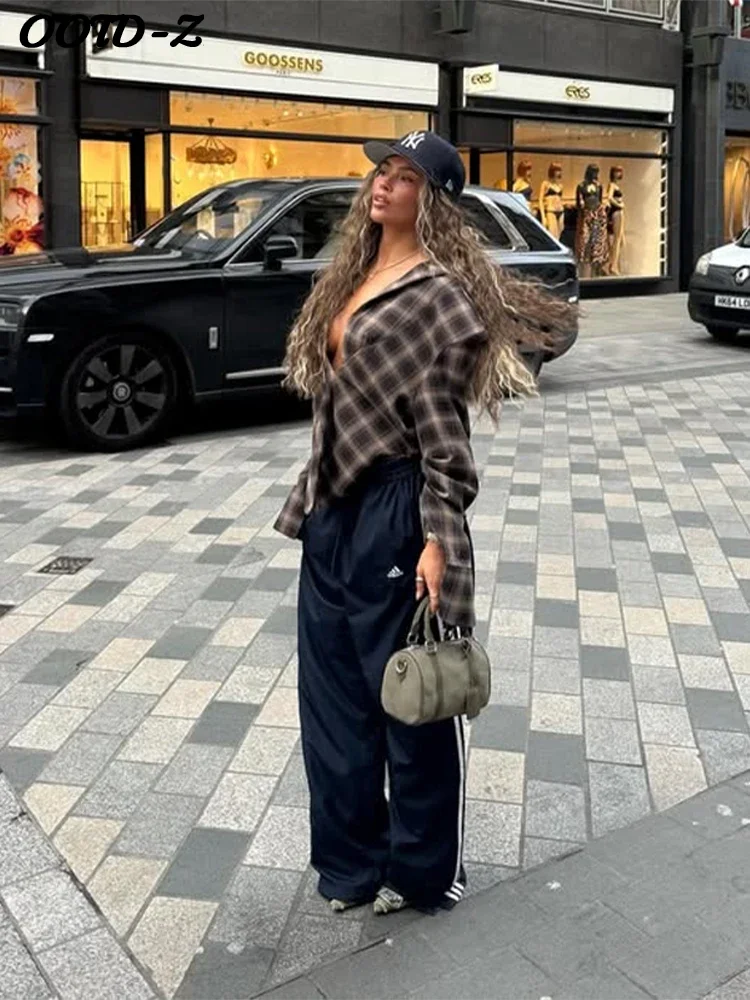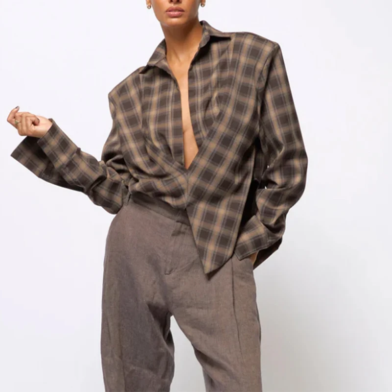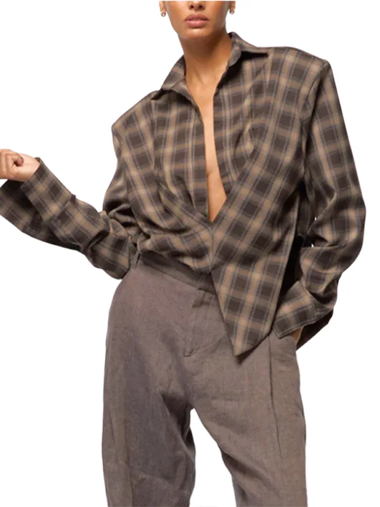 Rue Plaid col bas chemise femmes décontracté manches longues coupe ajustée Blouses plissées femme 2026 Sexy Vintage Chic printemps montre de sport