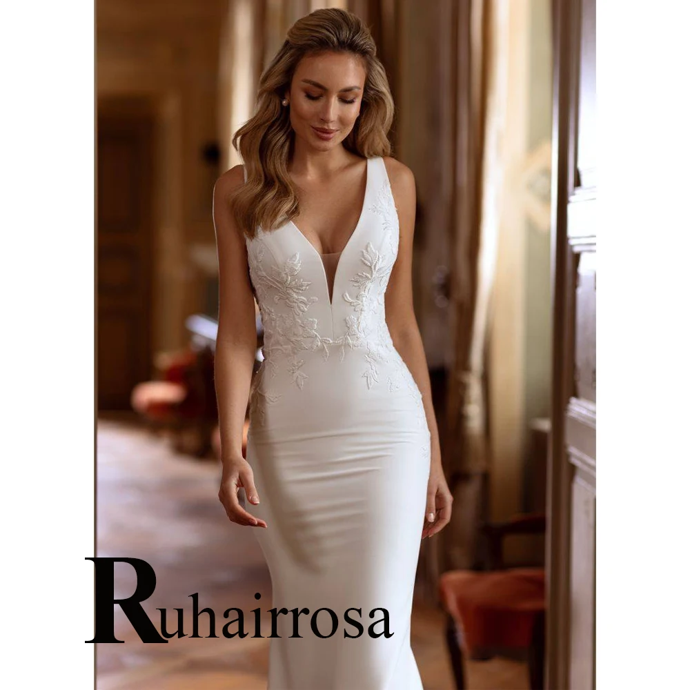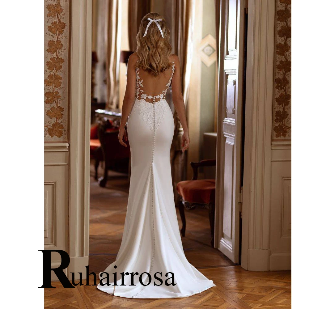 Ruhair Sexy dos nu sirène robes De mariée pour les femmes Appliques dentelle col en v réservoir bouton Satin sur mesure robes De Novia