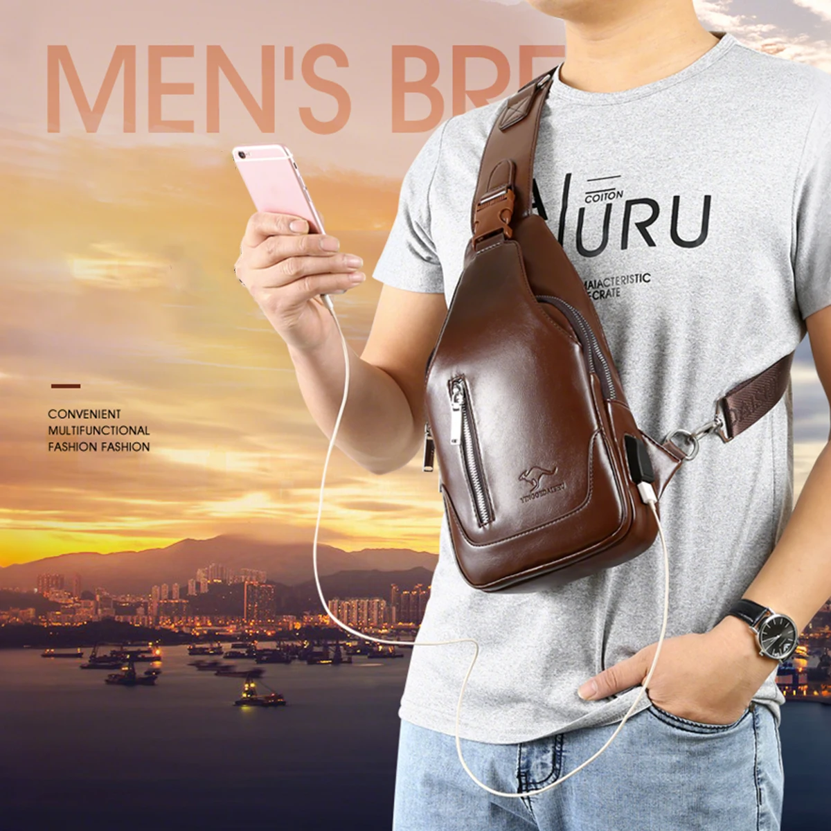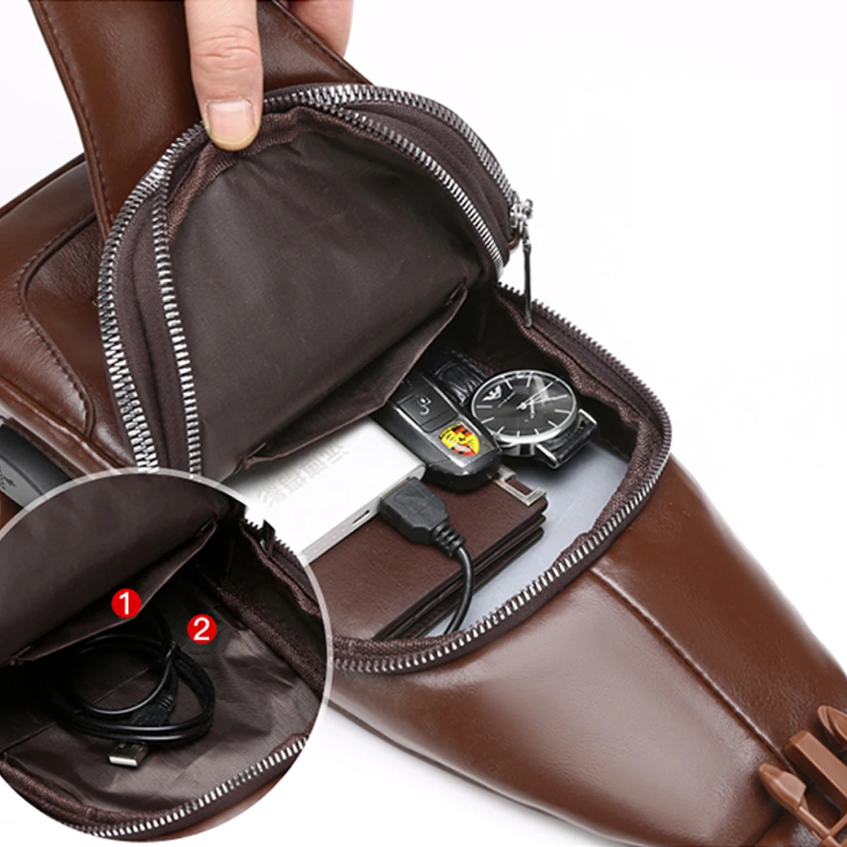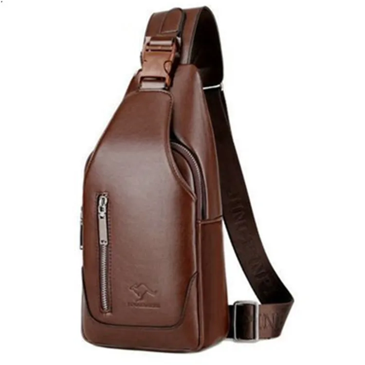 Sac de poitrine pour hommes d'affaires décontracté, Port USB, multi-poches, brillant cousu en PU, sac à bandoulière à fermeture éclair pour les déplacements, sac de rangement pour le Shopping