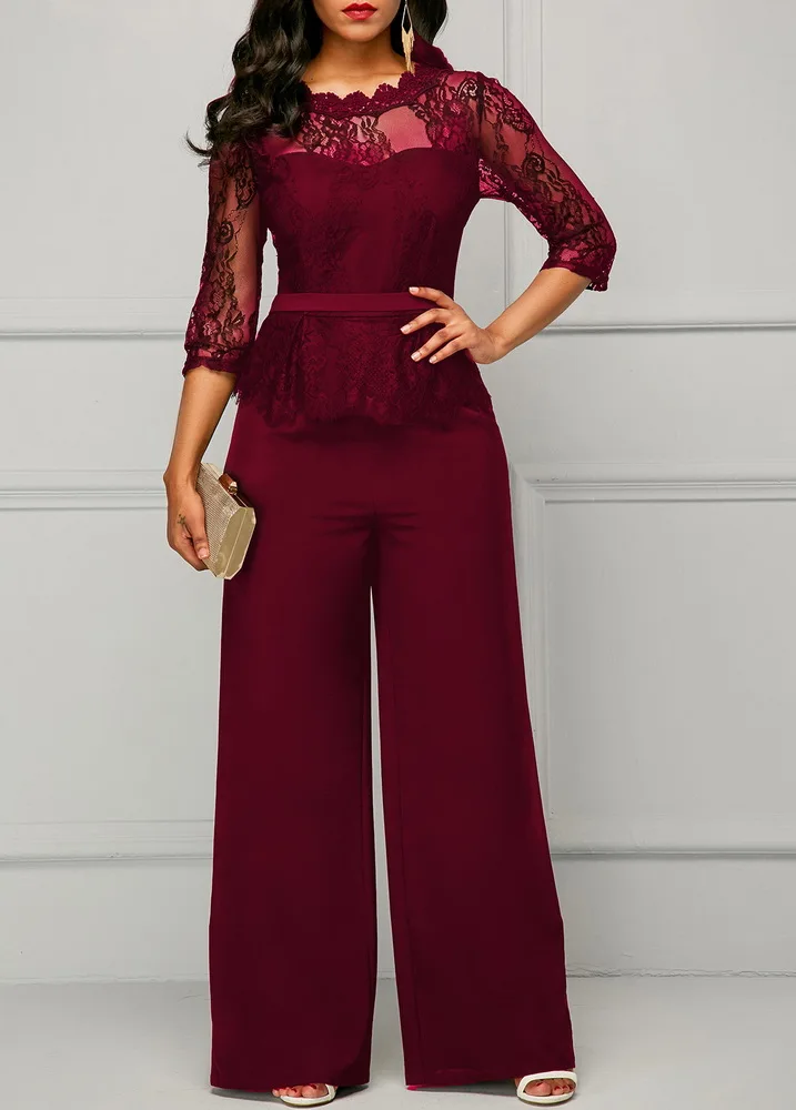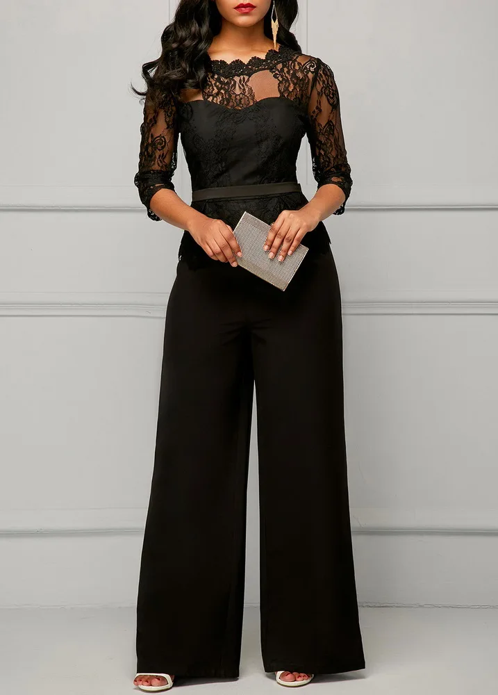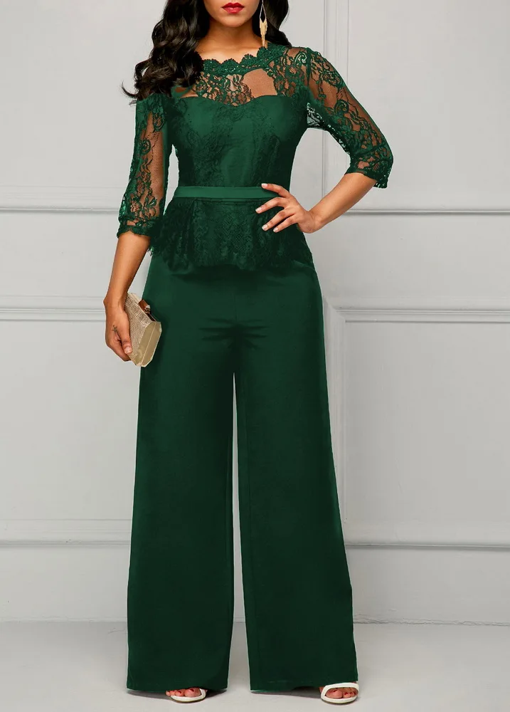 Salopette décontractée à jambe large Sexy femmes col rond solide dentelle élégante combinaison de fête droite barboteuses amples