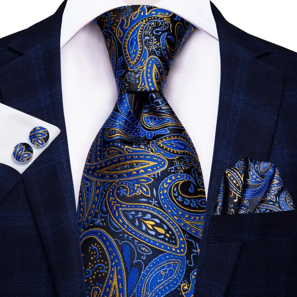 Hi-Tie Navy Blue Solid Paisley Silk Wedding Tie For Men Hanky Cufflink Mens Necktie Set Business Party New Design Dropshipping