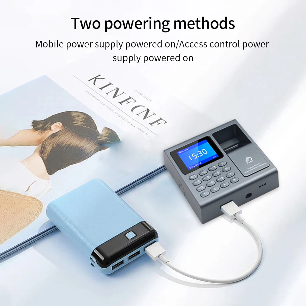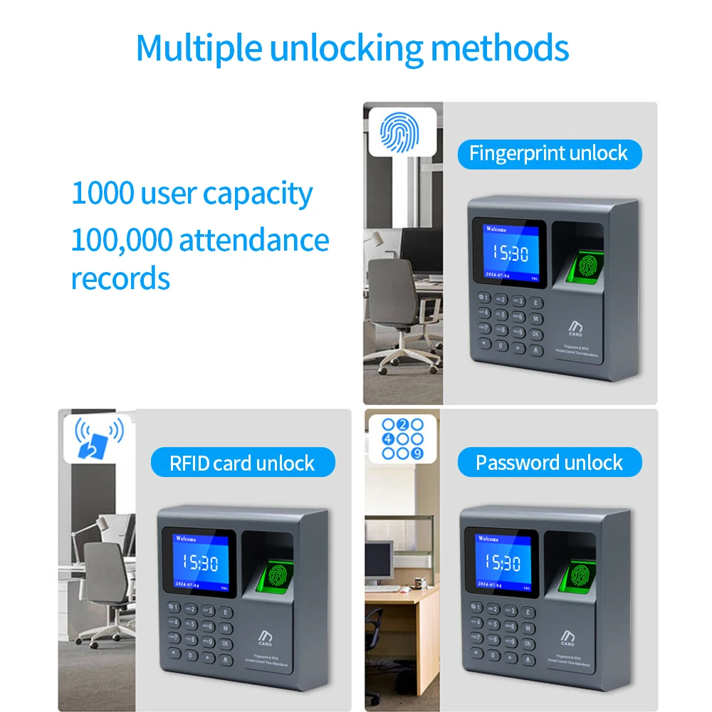 Avec cet enregistreur de temps par empreinte digitale, vous pouvez demander à votre personnel de se enregistrer au moyen d'une empreinte digitale, d'une carte RFID et d'un mot de passe.Prend en charge une capacité de 1 000 utilisateurs, 1 000 empreintes digitales, 1 000 mots de passe, 1 000 cartes RFID, une capacité d'enregistrement de pointage de 100 000 heures.