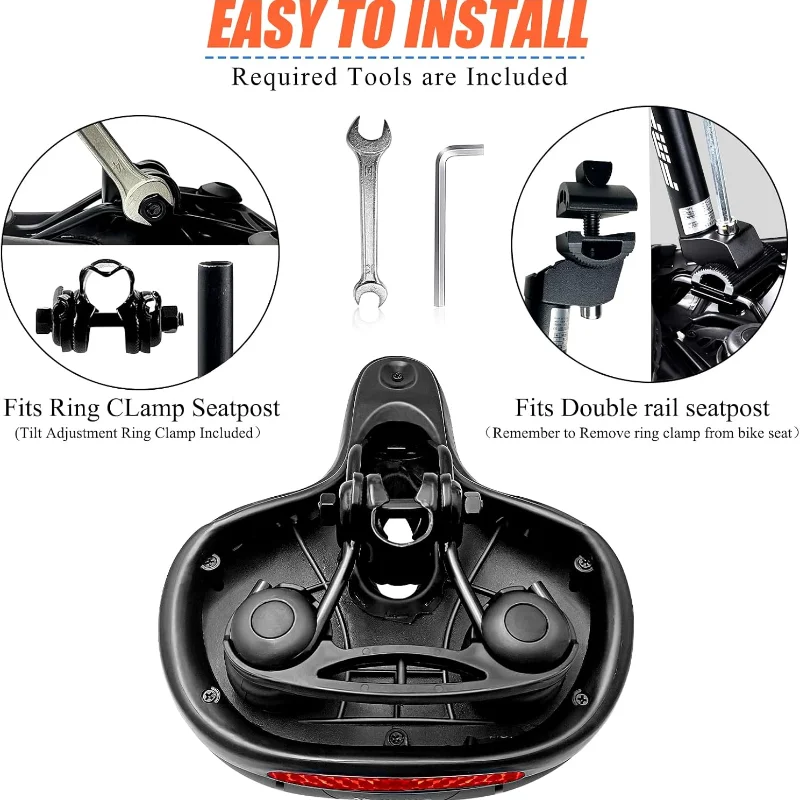 • Conception de ventilation améliorée - Utilisant des matériaux de surface respirants et à recirculation d'air, ce siège de vélo aide à garder le cycliste au sec et à l'aise pendant les longues sorties.Il est parfaitement adapté au cyclisme longue distance, au VTT, aux vélos de transport quotidien et aux aventures de voyage, assurant une circulation d'air optimale et réduisant l'accumulation de chaleur, pour une expérience de conduite plus agréable. • Excellente performance d'absorption des chocs - quipé de matériaux d'amortissement et d'absorption des chocs avancés, ce siège de vélo réduit efficacement les chocs, les routes irrégulières et les sentiers accidentés, offrant une expérience de conduite plus douce et plus stable.Il est idéal pour le cyclisme tout-terrain, les déplacements urbains, le VTT ou le cyclisme de loisir sur divers terrains. • Siège arrière ergonomique et spacieux - Doté d'un siège large et ergonomique avec un soutien et un amorti suffisants, ce siège de vélo assure un confort maximal lors des longs trajets.Adapté à différents types de vélos, y compris les vélos hybrides, les vélos de croisière et les VTT, il offre un excellent soutien pour les fesses et les hanches, réduit la fatigue et améliore la stabilité de la conduite. • Durable et résistant à la pluie - Fabriqué à partir de matériaux imperméables de haute qualité, il peut résister à diverses conditions météorologiques, assurant une durabilité à long terme et une performance stable.C'est un choix de mise à niveau fiable pour tous ceux qui recherchent le confort, la durabilité et une efficacité de conduite améliorée parmi les amateurs de cyclisme. • Installation facile et bonne compatibilité - Spécialement conçu pour la plupart des vélos standards (y compris les VTT, les vélos de route, les vélos de loisirs et les vélos hybrides), il s'installe rapidement.Compatible avec les systèmes de serrage et réglable pour s'adapter aux préférences de conduite individuelles. • Accessoires de cyclisme multifonctionnels - Cette selle de vélo confortable et durable est idéale pour le cyclisme de loisir, le cyclisme de fitness, le VTT, les déplacements urbains ou les longs trajets. Avec ce siège de vélo de conception ergonomique, il améliore votre confort et votre contrôle de conduite - c'est un produit de mise à niveau essentiel pour votre voyage à vélo.