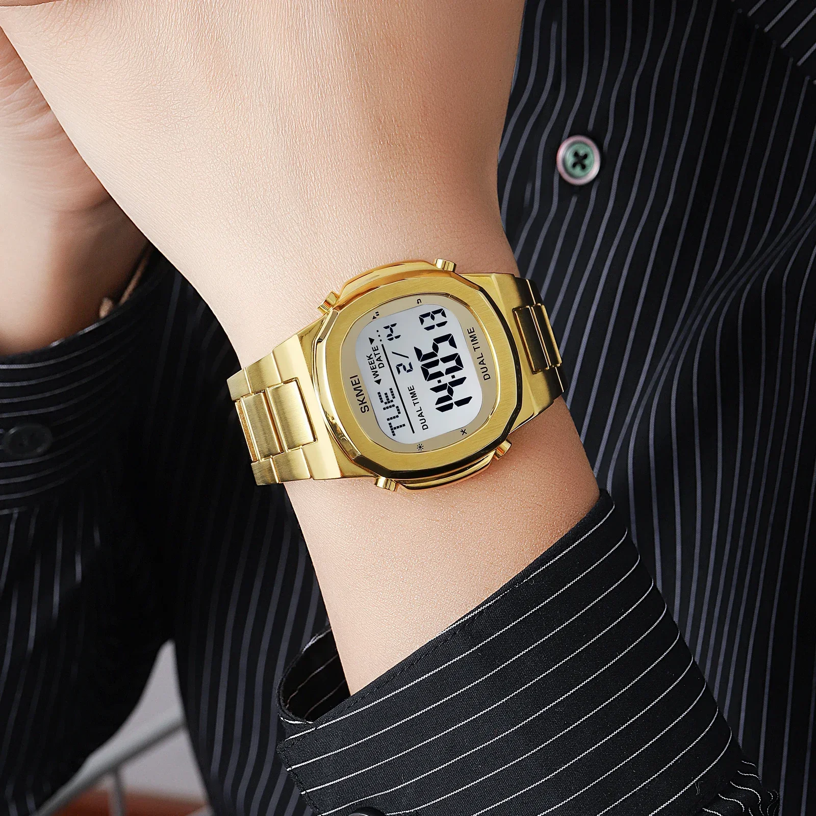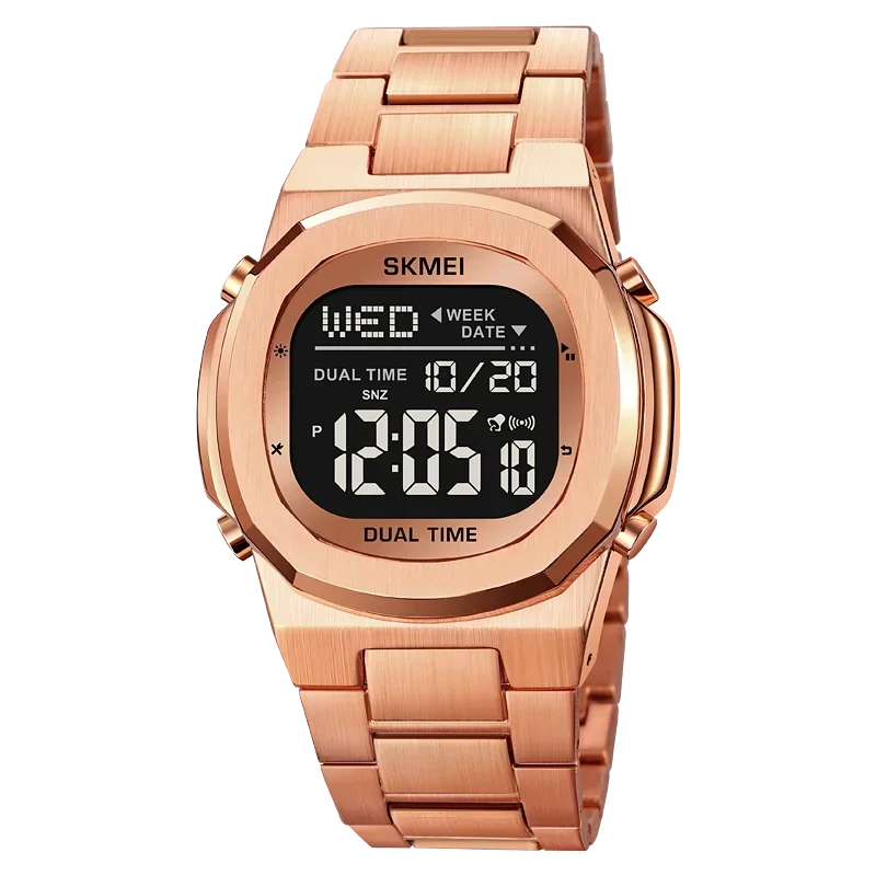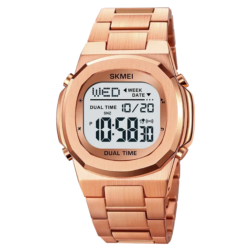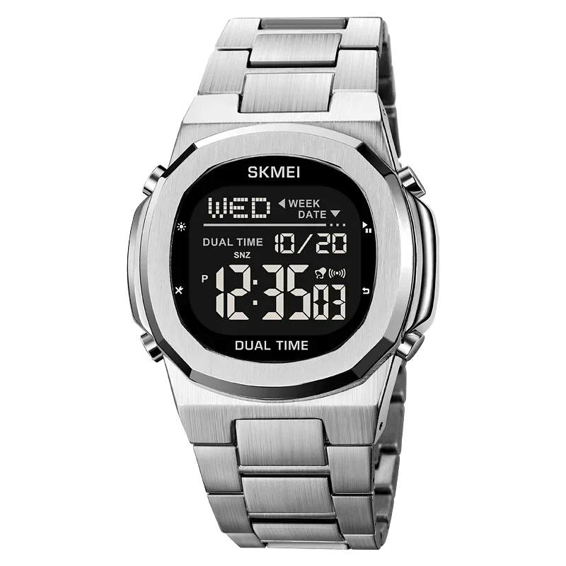 Caractéristiques du produit 1. Modèle: SKMEI femmes hommes montres numériques 2004 2.Mouvement : numérique 3.Miroir: verre 4.Boîtier : alliage 5.bracelet : acier inoxydable 6. Étanche: 3bar 7.Bande: acier inoxydable 8. Fonction : 2 heures, chrono, alarme, date, semaine, lumière EL, horloge 12/24 heures, compte à rebours. 9.Original: oui