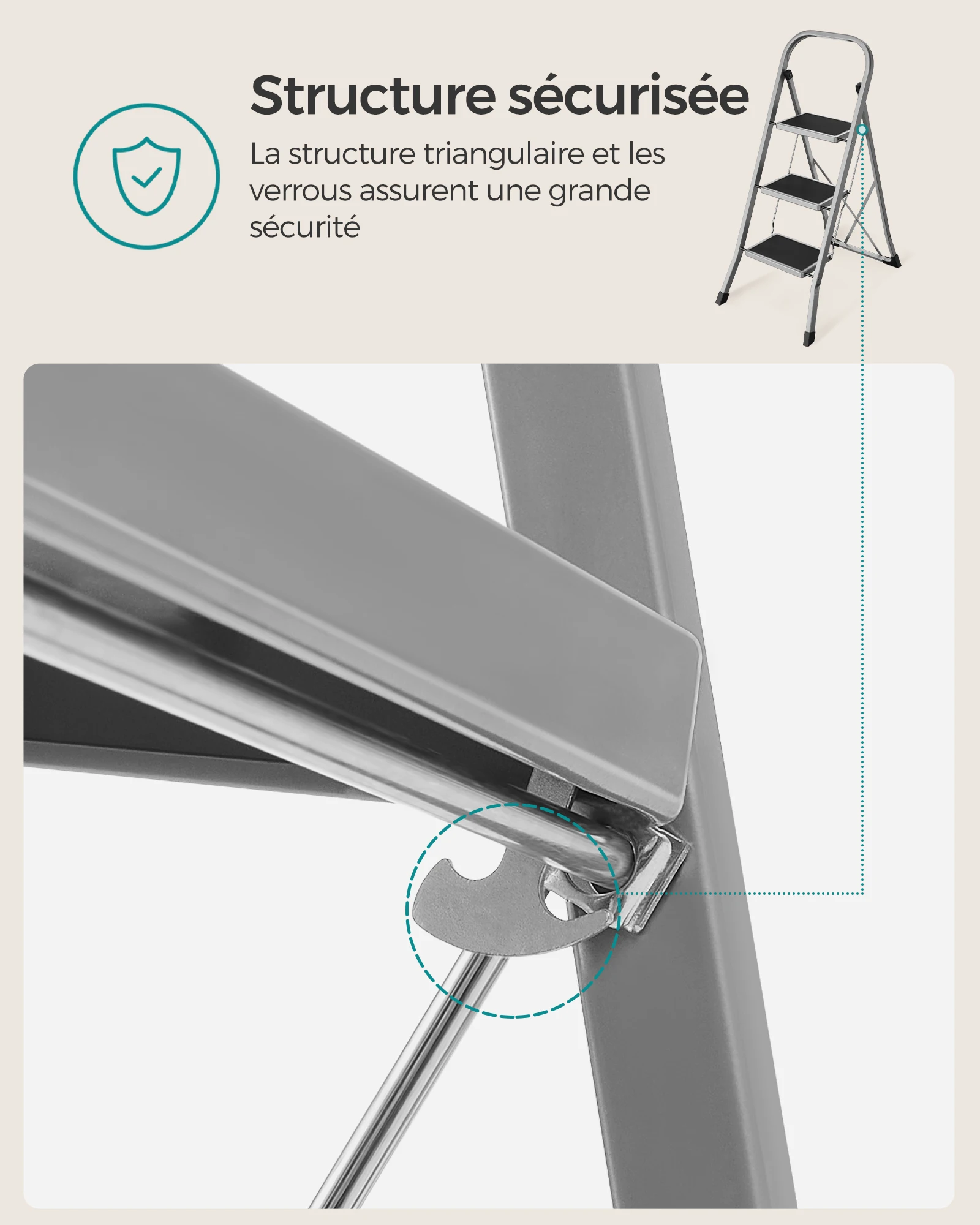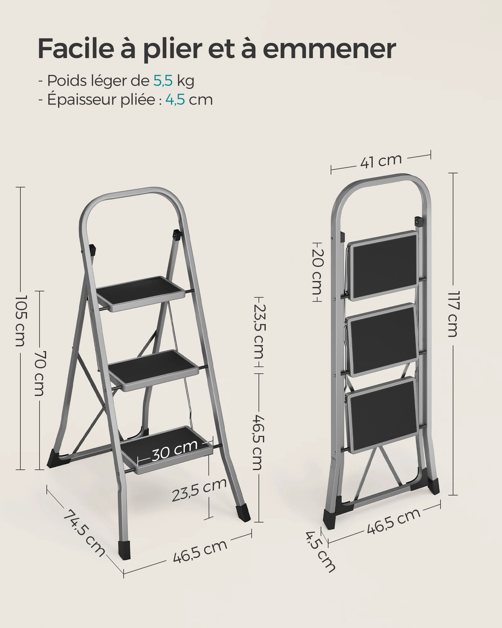 Alors ce petit escabeau de SONGMICS, il est parfait pour les tâches quotidiennes. Quand vos soutiens-gorge sont trop courts, vous pouvez monter facilité et en toute sécurité. Il est pliable, vous pouvez le plier à plat pour gagner de la place en cas de non-utilisation. Et avec son look simple et propre, il va avec plein de styles de déco.