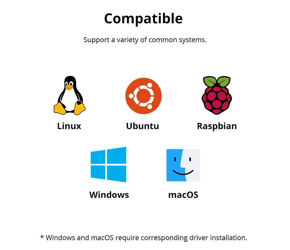 Dongle Plus prend en charge une variété de systèmes courants, comme Linux, Ubuntu, Raspbian, Windows, macOS (Windows et macOS nécessitent l'installation du pilote correspondante).