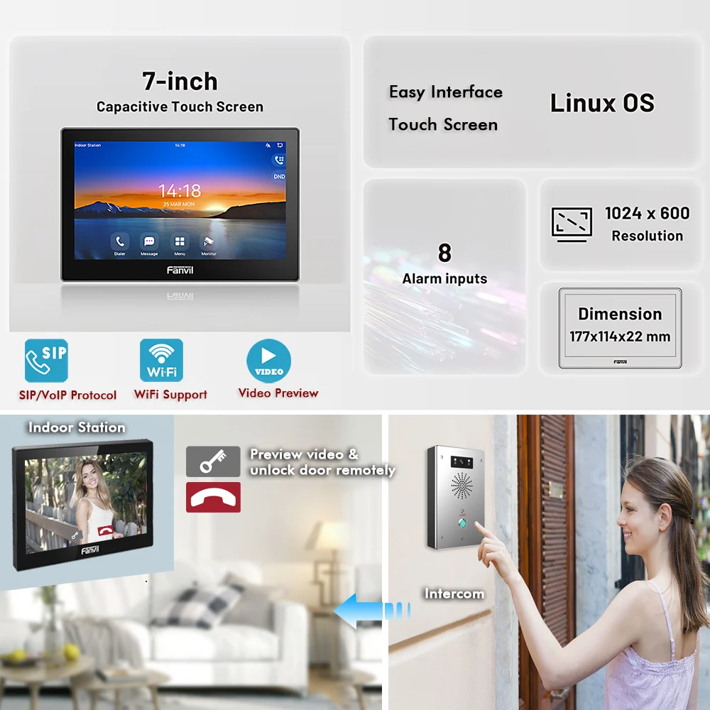 Station intérieure de réseau d'interphone vidéo Fanvil SIP, écran tactile de 7 pouces, activation PoE, moniteur sans fil WiFi, sonnette murale