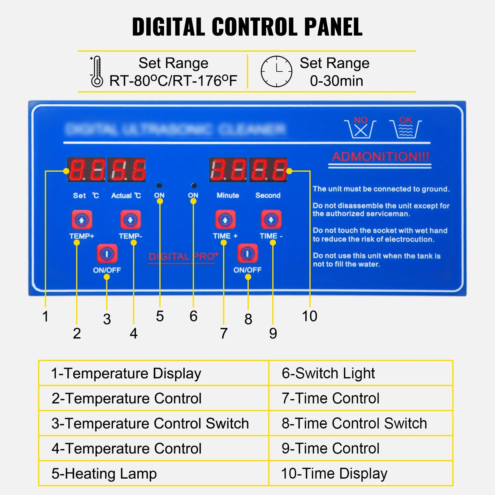 Le temps est réglable de 0 à 30 minutes et la température peut être réglée dans le RT-176℉/RT-80℃, affiché sur les écrans LED.La fonction de chauffage améliore considérablement l'efficacité du nettoyage.