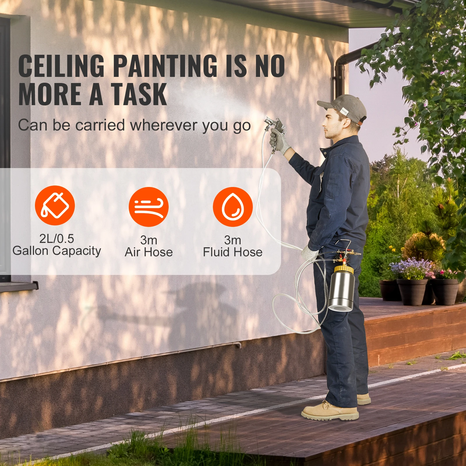 Le pot de pression a une capacité de 2 L/0,5 gall avec un diamètre d'entrée et de sortie de 1/4 pouces et un diamètre de sortie de fluide de 3/8 pouces.Il peut accueillir plus de types de peintures.Le joint de volume de 4,1 lb avec 2 tuyaux est facile à transporter et commencez à peindre partout o vous allez!