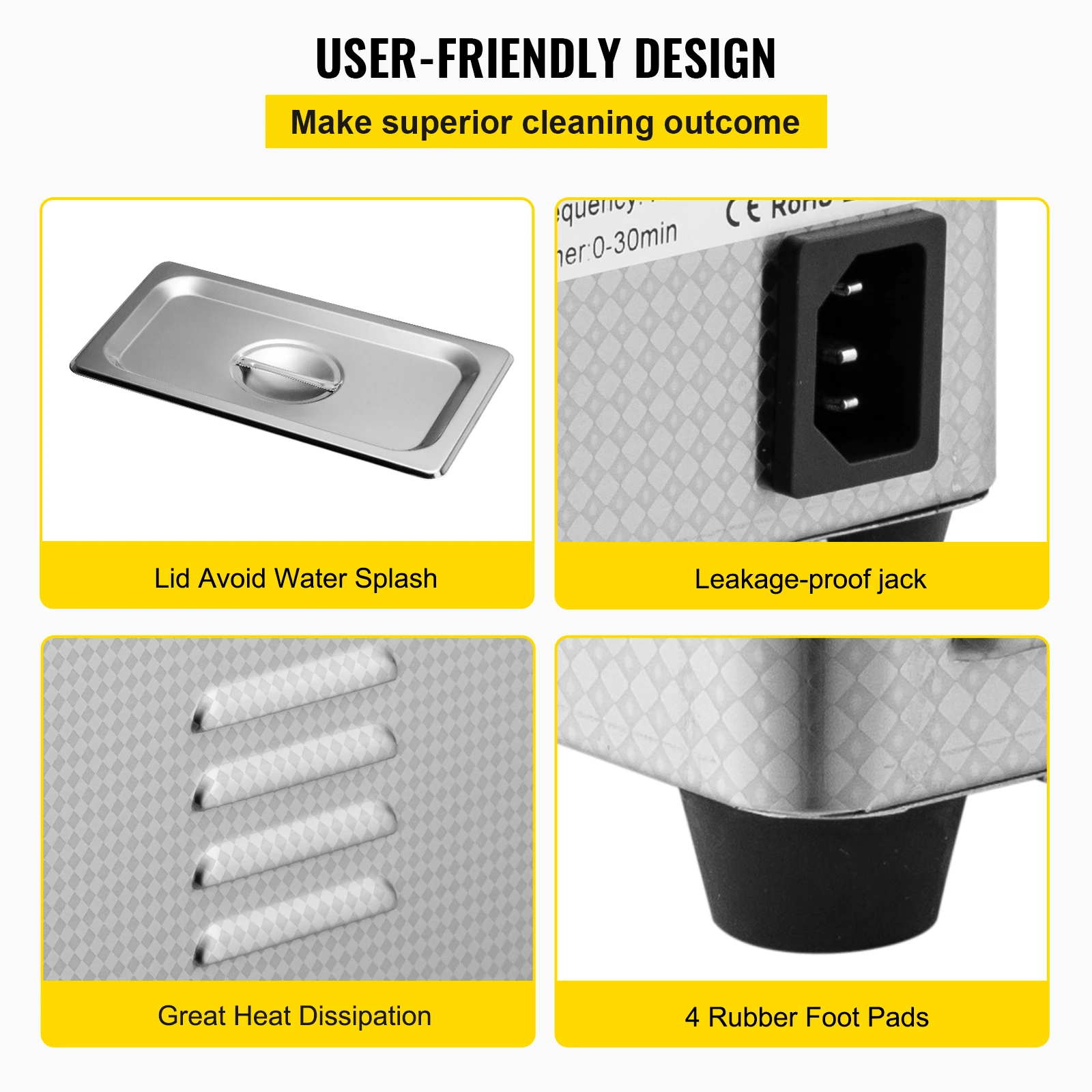 Conception conviviale : laveur à ultrasons de table, léger et facile à transporter/déplacer.Il est conçu pour une meilleure utilisation par le client : panier de lavage, prise sécurisée, dissipation de la chaleur, pieds en caoutchouc antidérapants et couvercle supérieur avec poignée.