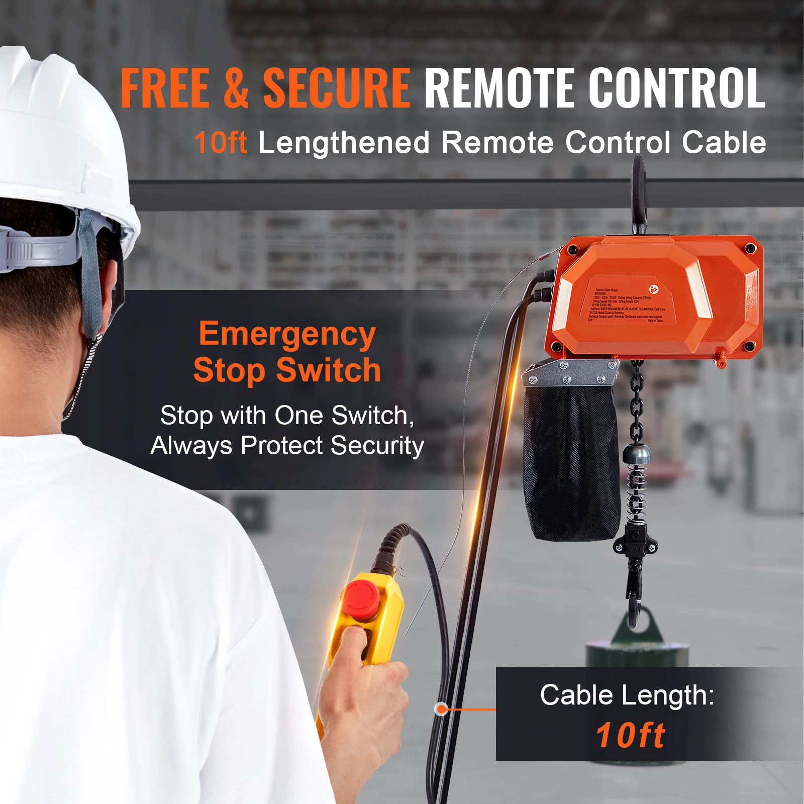 Câble de commande étendu : la télécommande filaire de notre palan élévateur électrique à chane est réalisée via l'interrupteur à poignée installé sur la machine par le câble.La longueur du câble étendu est de 10 pieds/3 m, vous permettant de fonctionner à une distance de sécurité.