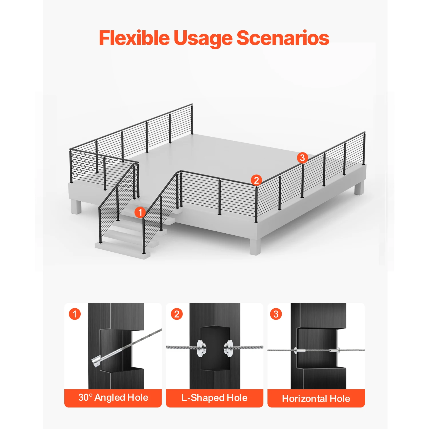 Notre kit de garde-corps à câble comprend des supports plats et incurvés, compatibles avec les mains courantes à tuyaux carrés et ronds, permettant la personnalisation DIY des angles de main courante (les trous de type L prennent en charge uniquement la personnalisation de l'angle de main courante unidirectionnelle).
