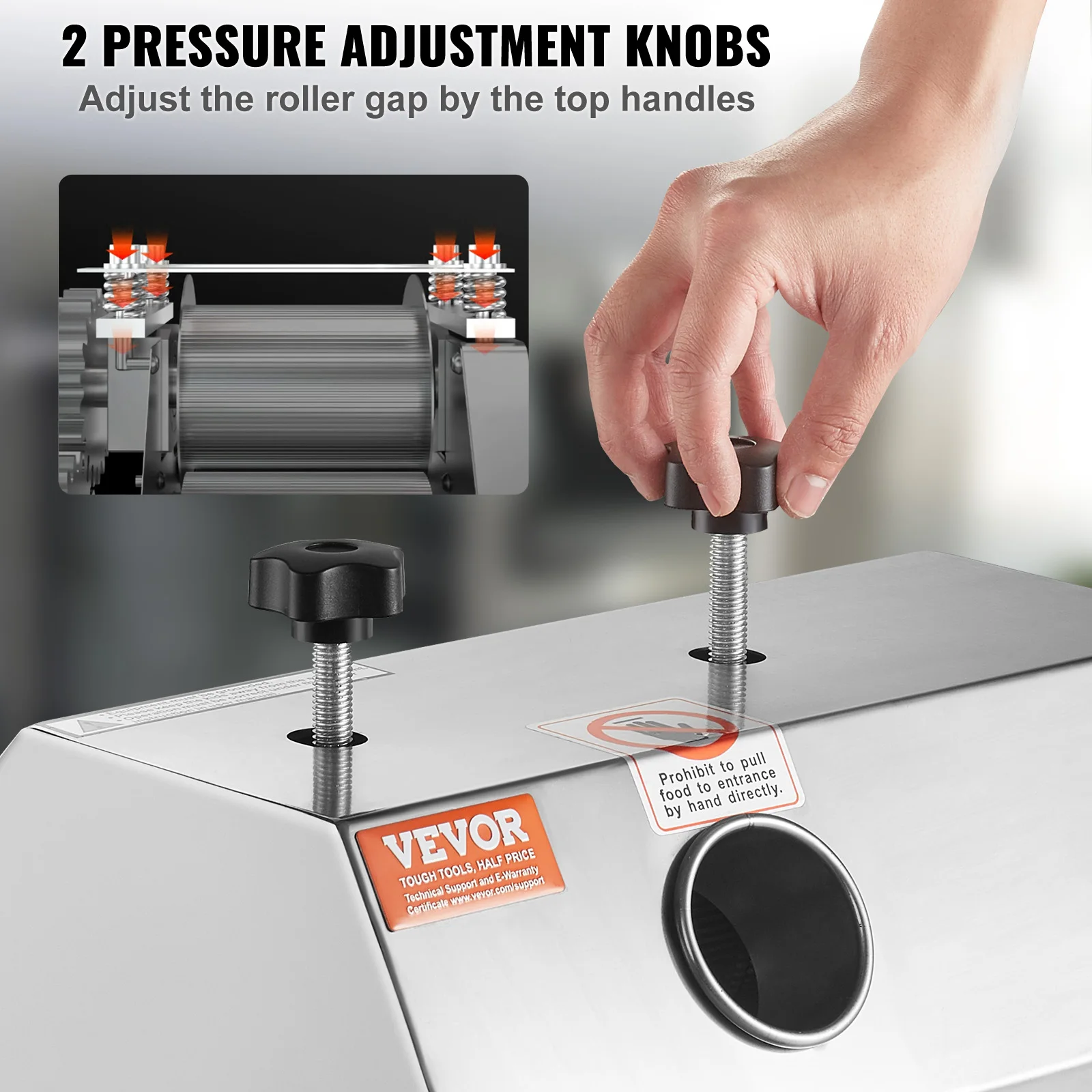 Réglage manuel facile : avec 2 régulateurs de pression à rouleaux situés sur le dessus de la machine, vous pouvez facilement ajuster l'espace entre les rouleaux en fonction des différentes tailles de canne.De plus, la grande entrée d'alimentation de 2,4 pouces (62 mm) peut accueillir facilement une canne à sucre de plus grande taille.