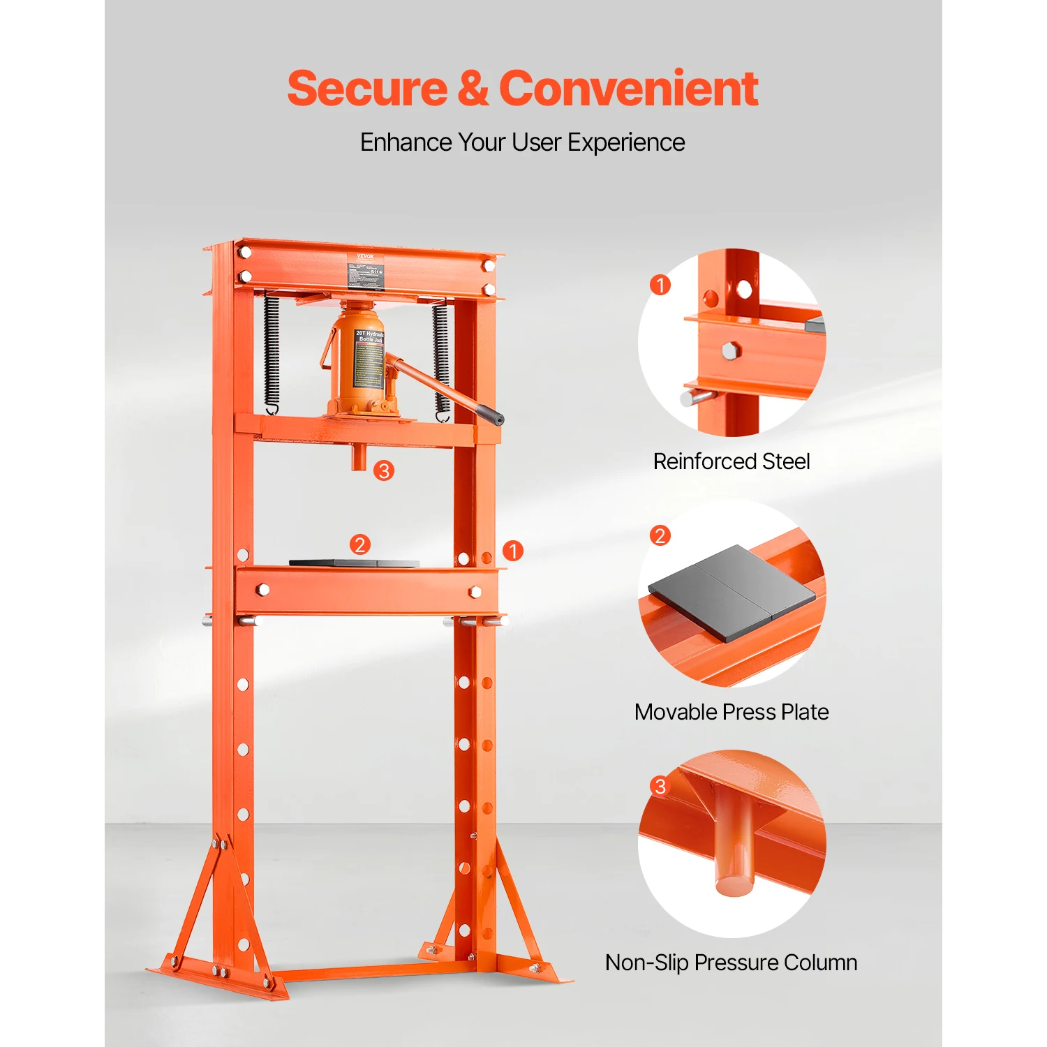 Une aide puissante dans la réparation de véhicules Notre presse automobile est fabriquée en acier robuste de haute qualité, améliorant considérablement la stabilité de la base.Cela garantit un fonctionnement plus sûr et plus fiable lors du démontage et de l'installation de composants tels que des bagues, des roulements, des rotules, des joints en U et d'autres pièces. Caractéristiques et détails Forte capacité de charge de 20 tonnes : notre presse hydraulique vous aide à démonter et à installer facilement les bagues automobiles, les rotules, les joints en U et plus encore, ainsi qu'à redresser, plier et tamponner les pièces métalliques.Que vous soyez un professionnel ou un passionné de réparation automobile DIY, il permet une utilisation rapide et simple. Vanne de régulation de sécurité : pour un fonctionnement plus sûr, le cric hydraulique de la presse hydraulique est équipé d'une vanne de régulation de sécurité.Lorsque la pression de charge dépasse la capacité nominale, elle évite un abaissement supplémentaire, réduisant ainsi le risque de flexion ou de dommages dus à une surpression. Hauteur réglable : la table de travail de la presse hydraulique est dotée d'un système de broches à réglage rapide avec 7 réglages de hauteur, allant de 2,0 à 32,7 pouces (50-830 mm), offrant des positions de travail flexibles.La course du cylindre est de 5,7 pouces (145 mm). Renfort de base triangulaire : améliorée avec une attelle triangulaire, la structure triangulaire de la presse hydraulique améliore considérablement la stabilité de la base.Combinée avec le cadre en forme de H, la presse reste stable et résistante aux oscillations lors du fonctionnement des composants de fixation. Construction robuste : construite en acier épaissi, cette structure offre une capacité de charge et une durabilité améliorées. La colonne de pression de grand diamètre est conçue pour minimiser le glissement, garantissant robustesse et performances durables, même en cas d'utilisation intensive.