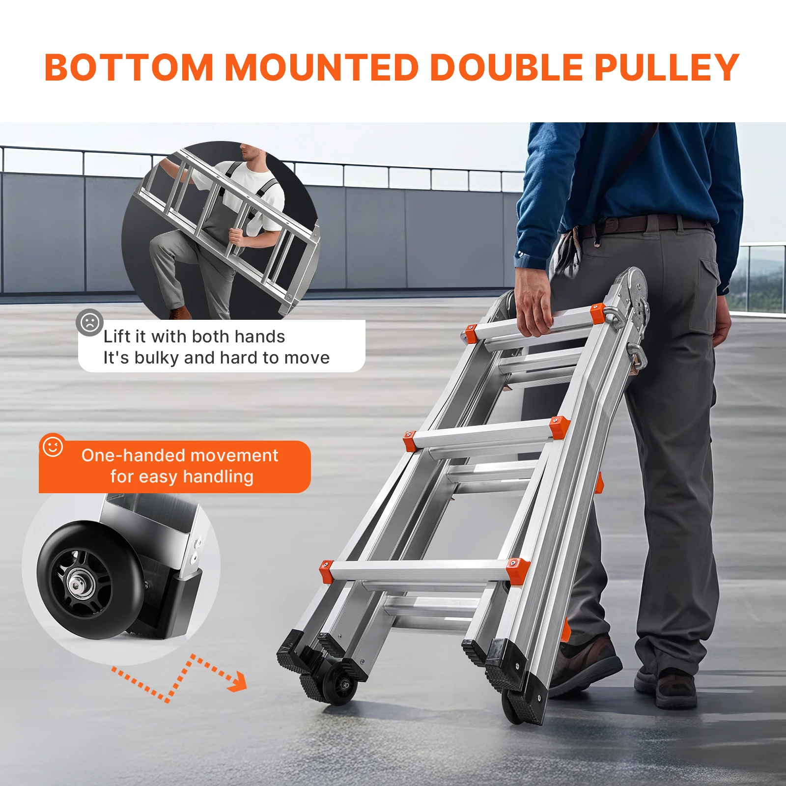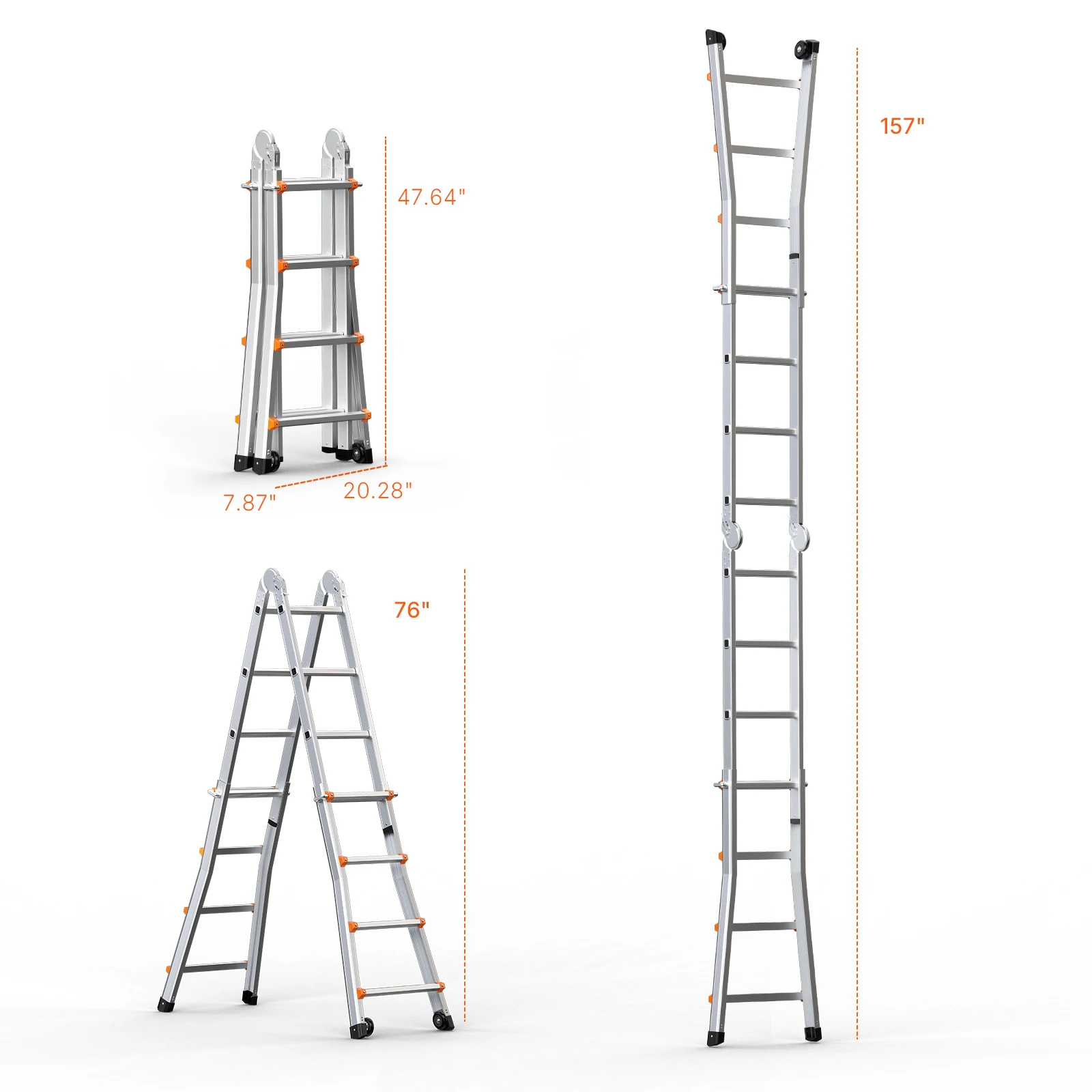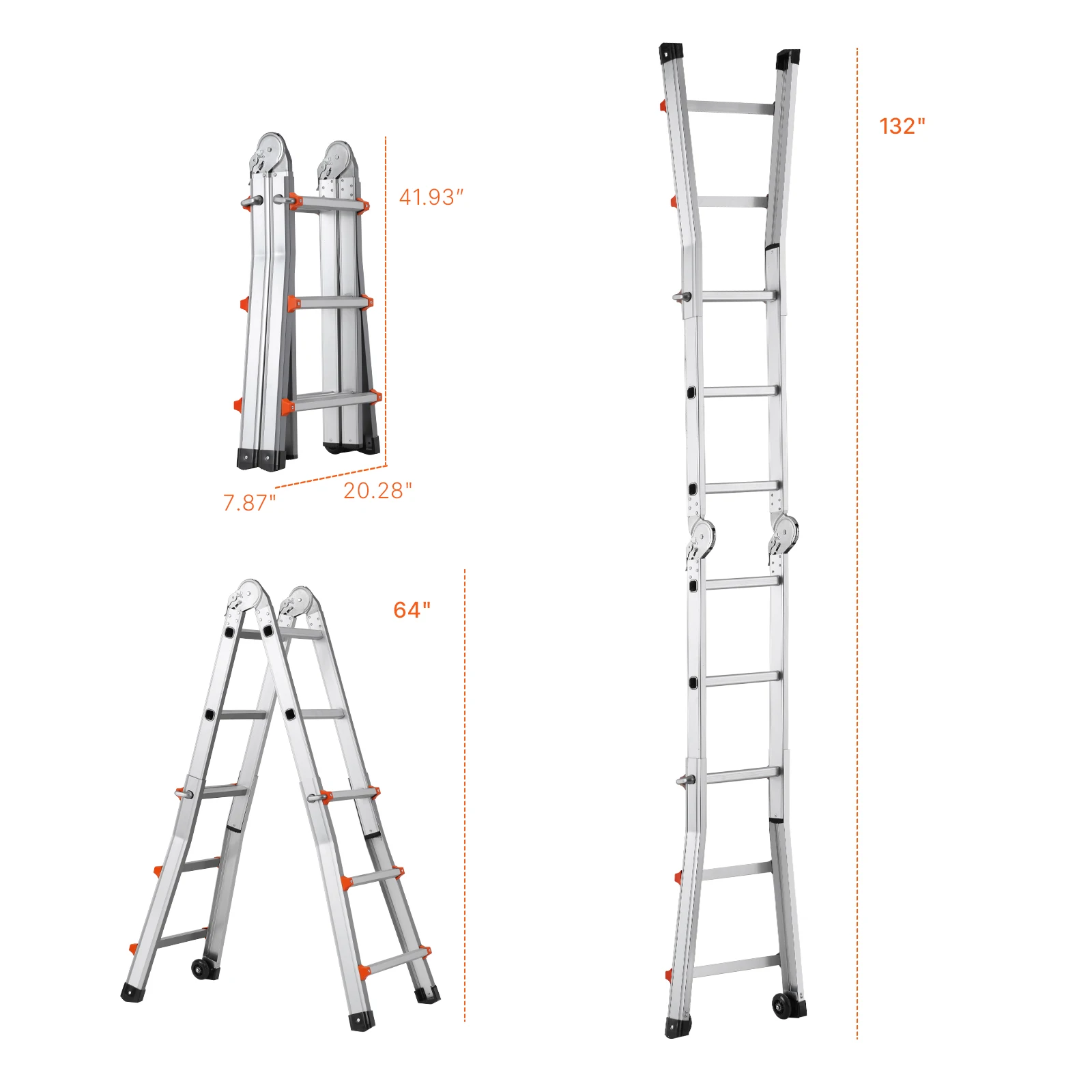 Atteignez de nouveaux sommets en toute confiance! Cette échelle d'extension polyvalente à cadre en A peut être étendue et contractée en plusieurs configurations pour répondre à diverses exigences de hauteur, ce qui la rend adaptée à différents scénarios.Ses pieds inclinés vers l'extérieur offrent une stabilité et une adhérence améliorées, ne nécessitant aucun assemblage. Fabriquée en alliage d'aluminium de haute qualité, cette échelle légère et portable offre une excellente capacité de poids et durabilité, assurant votre sécurité pendant l'utilisation. quipée de pieds antidérapants, cette échelle reste stable sur diverses surfaces, offrant une protection à votre revêtement de sol tout en empêchant les glissements, même lorsqu'elle est utilisée en solo. Cette échelle d'extension multifonctionnelle à cadre en A présente une conception de charnière unique qui permet une commutation facile entre trois angles : 35, 107, et 180, répondant à différentes exigences de hauteur. Conçue avec un mécanisme de piste coulissante, cette échelle s'étend et se rétracte sans effort, permettant des réglages rapides sans avoir besoin de démontage ou de montage, vous permettant ainsi d'économiser du temps et de l'énergie. Caractéristiques et détails chelle sécurisée à cadre en A : conçue avec une structure à cadre en A pour une stabilité améliorée, cette échelle d'extension supporte une capacité de poids allant jusqu'à 330 lb.Il ne nécessite aucun assemblage, ce qui permet une utilisation immédiate, et sa conception antidérapante assure une tranquillité d'esprit lorsque vous travaillez en hauteur. Facile à déplacer : la base est dotée de deux roues, ce qui la rend facile à transporter d'une seule main, résolvant ainsi les tracas liés au levage des échelles traditionnelles et rendant votre expérience plus agréable. chelle polyvalente : cette échelle télescopique à cadre s'adapte à divers besoins, passant facilement entre différentes configurations.Avec pieds extensibles pouvant atteindre 180 et une hauteur maximale de 9,5 pieds / 2880 mm, il est parfait pour l'entretien ou le nettoyage du grenier. Sûr et stable : chaque marche comprend un mécanisme de verrouillage pour maintenir l'échelle stable pendant l'utilisation, empêchant tout glissement ou pliage pour une montée en toute sécurité.Le déverrouillage est simple en tirant, garantissant une facilité d'utilisation. Robuste et durable : fabriquée en alliage d'aluminium à haute résistance, cette échelle à cadre est conçue pour durer sans se plier ni se casser, même lorsqu'elle est utilisée en hauteur. Le fond est équipé de patins antidérapants pour plus de sécurité.