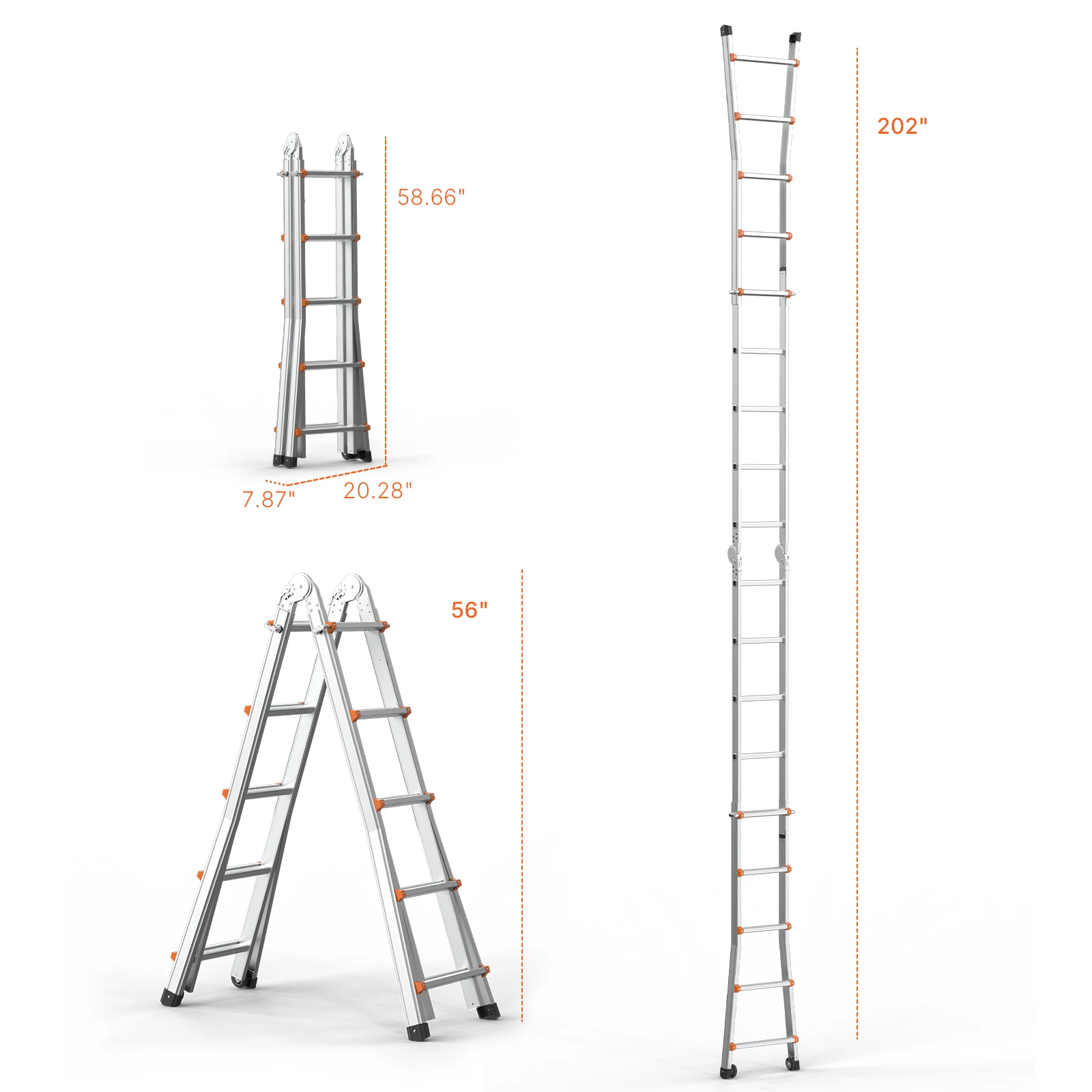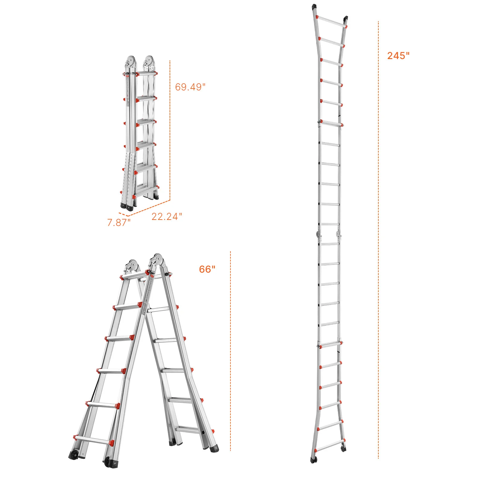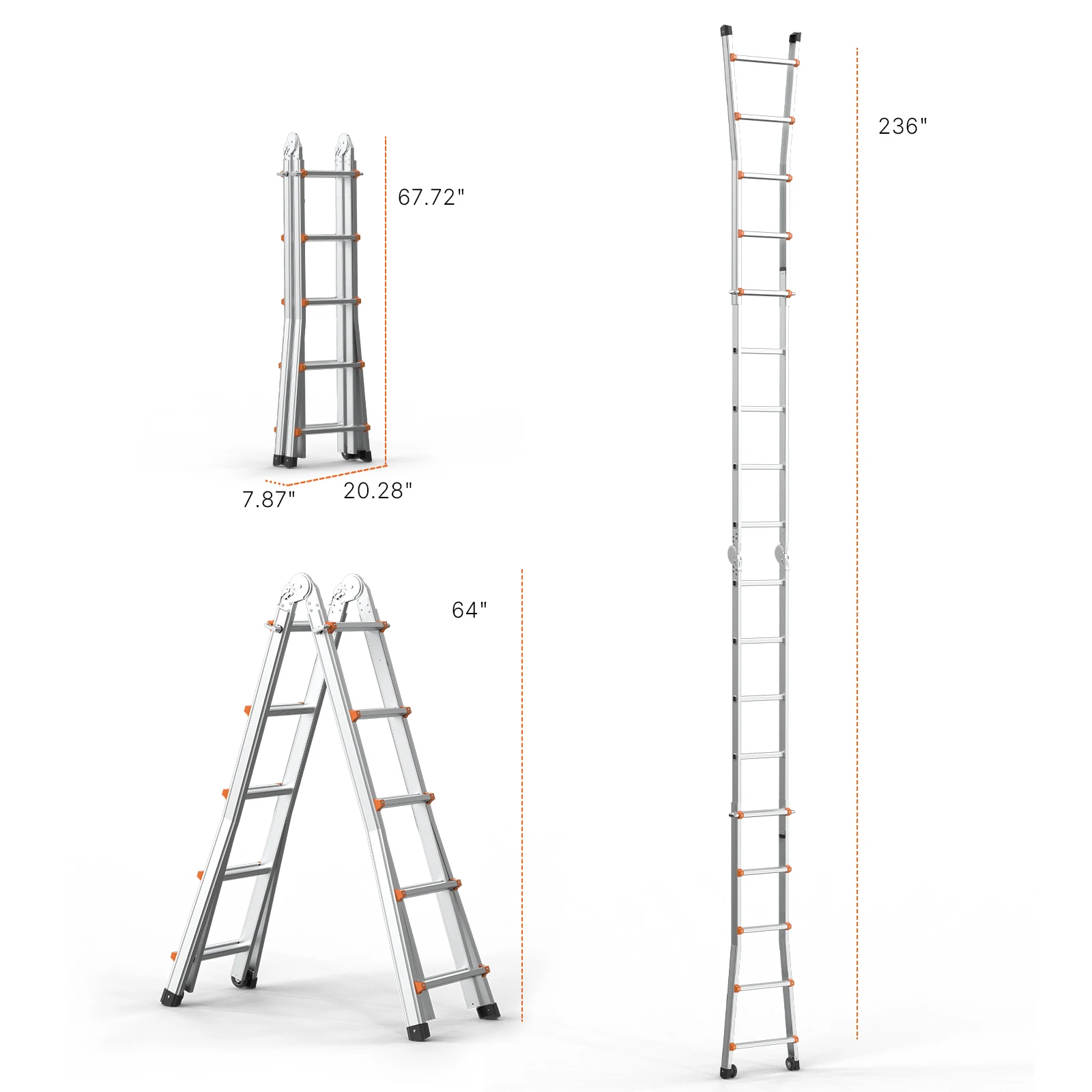Atteignez de nouveaux sommets en toute confiance! Cette échelle d'extension polyvalente à cadre en A peut être étendue et contractée en plusieurs configurations pour répondre à diverses exigences de hauteur, ce qui la rend adaptée à différents scénarios.Ses pieds inclinés vers l'extérieur offrent une stabilité et une adhérence améliorées, ne nécessitant aucun assemblage. Fabriquée en alliage d'aluminium de haute qualité, cette échelle légère et portable offre une excellente capacité de poids et durabilité, assurant votre sécurité pendant l'utilisation. quipée de pieds antidérapants, cette échelle reste stable sur diverses surfaces, offrant une protection à votre revêtement de sol tout en empêchant les glissements, même lorsqu'elle est utilisée en solo. Cette échelle d'extension multifonctionnelle à cadre en A présente une conception de charnière unique qui permet une commutation facile entre trois angles : 35, 107, et 180, répondant à différentes exigences de hauteur. Conçue avec un mécanisme de piste coulissante, cette échelle s'étend et se rétracte sans effort, permettant des réglages rapides sans avoir besoin de démontage ou de montage, vous permettant ainsi d'économiser du temps et de l'énergie. Caractéristiques et détails chelle sécurisée à cadre en A : conçue avec une structure à cadre en A pour une stabilité améliorée, cette échelle d'extension supporte une capacité de poids allant jusqu'à 330 lb.Il ne nécessite aucun assemblage, ce qui permet une utilisation immédiate, et sa conception antidérapante assure une tranquillité d'esprit lorsque vous travaillez en hauteur. Facile à déplacer : la base est dotée de deux roues, ce qui la rend facile à transporter d'une seule main, résolvant ainsi les tracas liés au levage des échelles traditionnelles et rendant votre expérience plus agréable. chelle polyvalente : cette échelle télescopique à cadre s'adapte à divers besoins, passant facilement entre différentes configurations.Avec pieds extensibles pouvant atteindre 180 et une hauteur maximale de 9,5 pieds / 2880 mm, il est parfait pour l'entretien ou le nettoyage du grenier. Sûr et stable : chaque marche comprend un mécanisme de verrouillage pour maintenir l'échelle stable pendant l'utilisation, empêchant tout glissement ou pliage pour une montée en toute sécurité.Le déverrouillage est simple en tirant, garantissant une facilité d'utilisation. Robuste et durable : fabriquée en alliage d'aluminium à haute résistance, cette échelle à cadre est conçue pour durer sans se plier ni se casser, même lorsqu'elle est utilisée en hauteur. Le fond est équipé de patins antidérapants pour plus de sécurité.