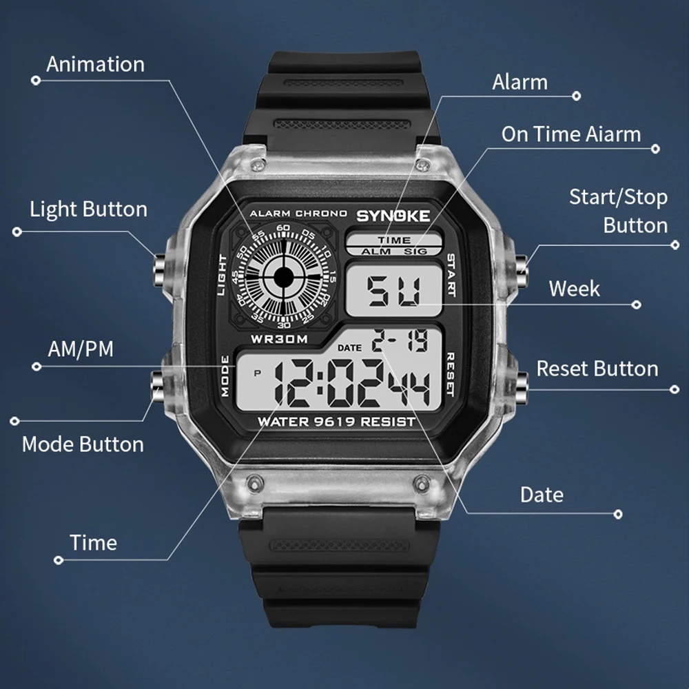 SYNOKE montre-bracelet pour hommes numérique sport montre étanche Transparent multifonction chronographe alarme rétro-éclairage reloj hombre
