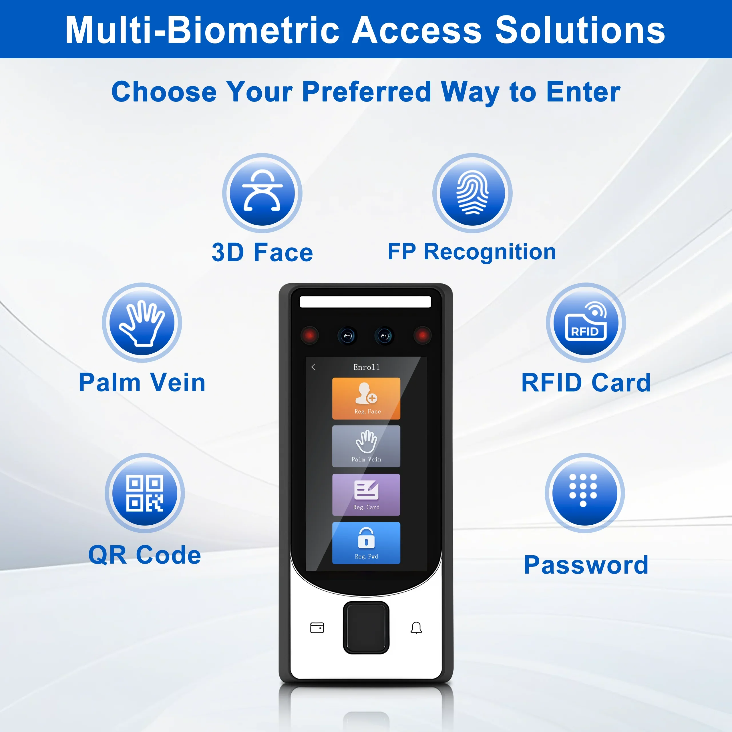 Méthodes d'enregistrement : visage, veine de palmier, mot de passe, carte Mifare