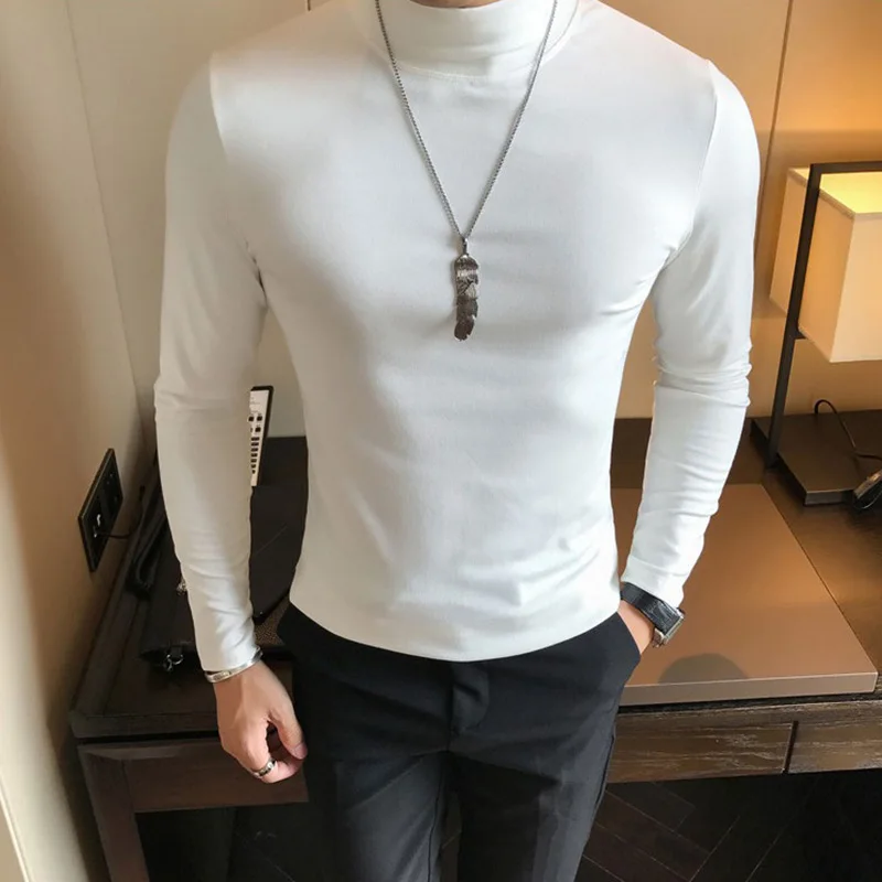T-shirt à col roulé pour hommes, manches longues, coupe cintrée, couleur unie, pull à fond hautement élastique, Style basique, nouvelle collection printemps