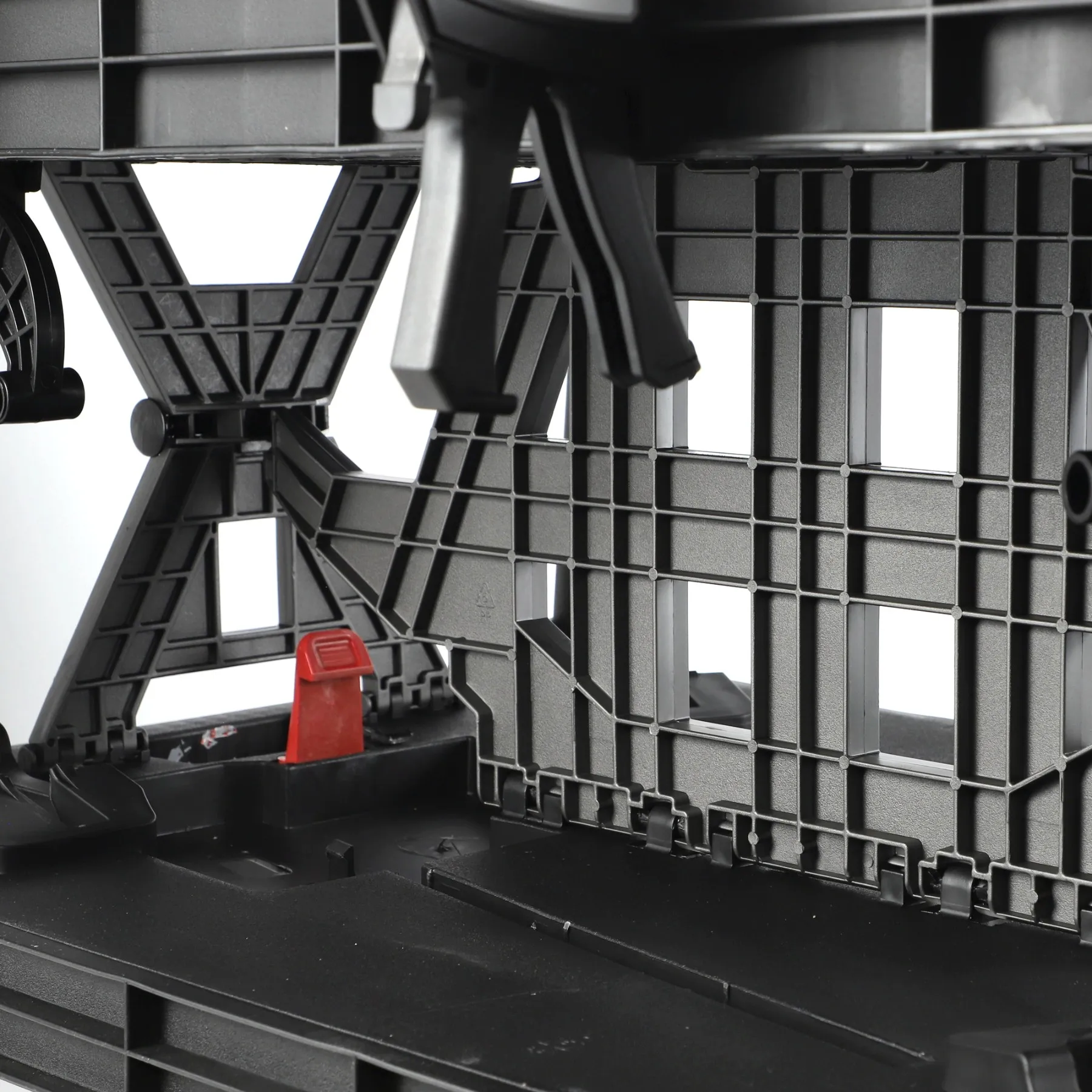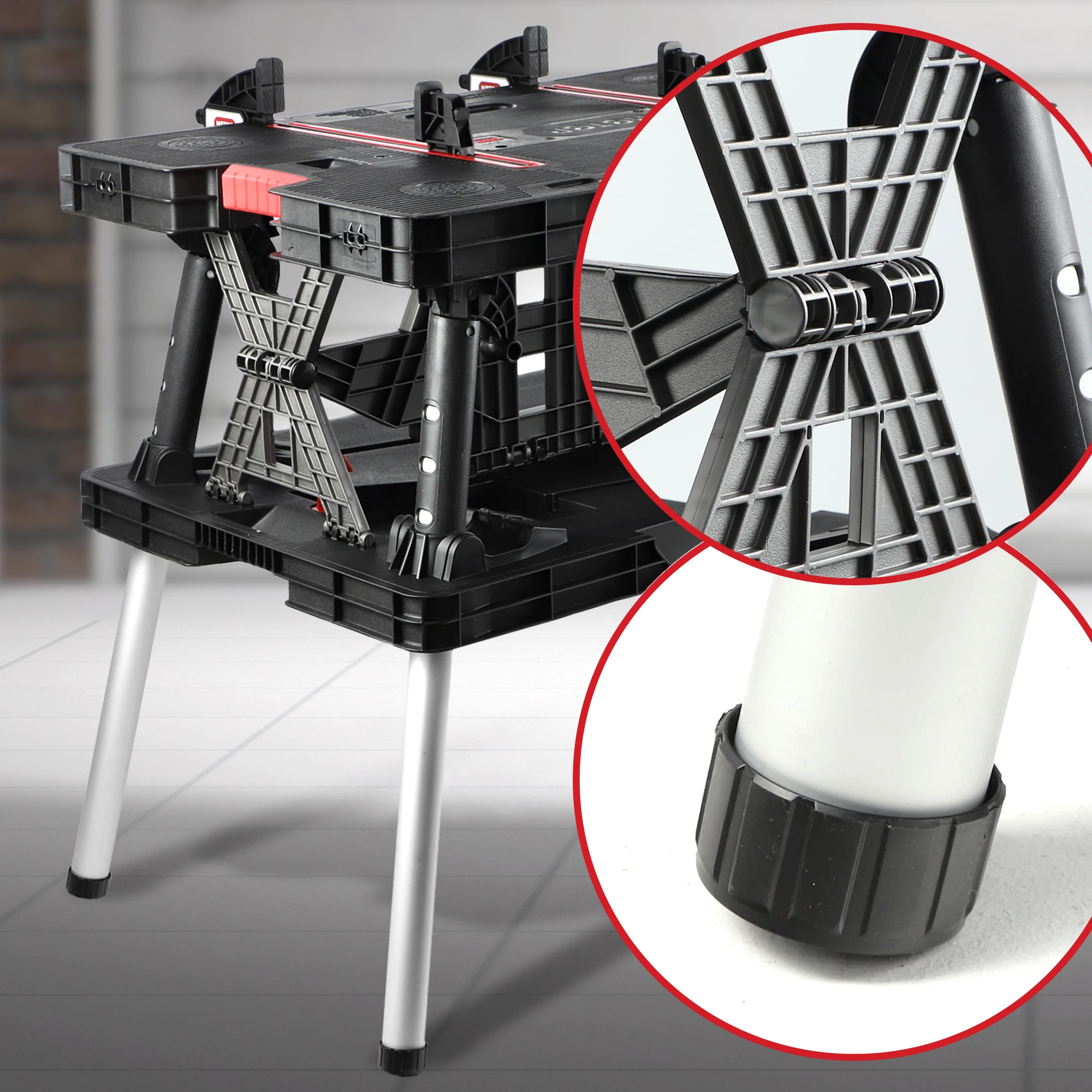 Notre établi pliant est fonctionnel. Premièrement: il dispose d'un système spécial pour le dépliage et le pliage rapides, ce qui le rend beaucoup plus facile à bricoler. Deuxièmement: le grand espace de travail de la table, qui peut atteindre 180 kg, permet également de réaliser des travaux complexes. Troisièmement: le produit dans le kit a deux pinces, qui assurent la stabilité de la surface de travail.