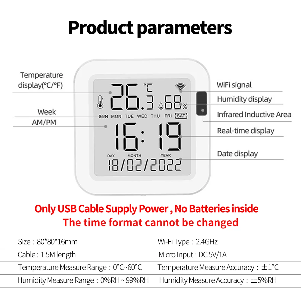 Le capteur utilise une alimentation USB.Par rapport à la version à batterie, le capteur surveillera la température et l'humidité en temps réel.