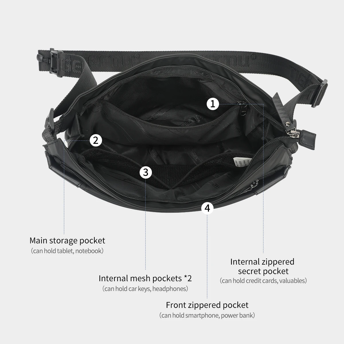 3. Poids léger avec une grande capacité de 4,5 L, adapté pour un Ipad de 9.7 pouces. Conception de cloison raisonnable et poches multifonctionnelles