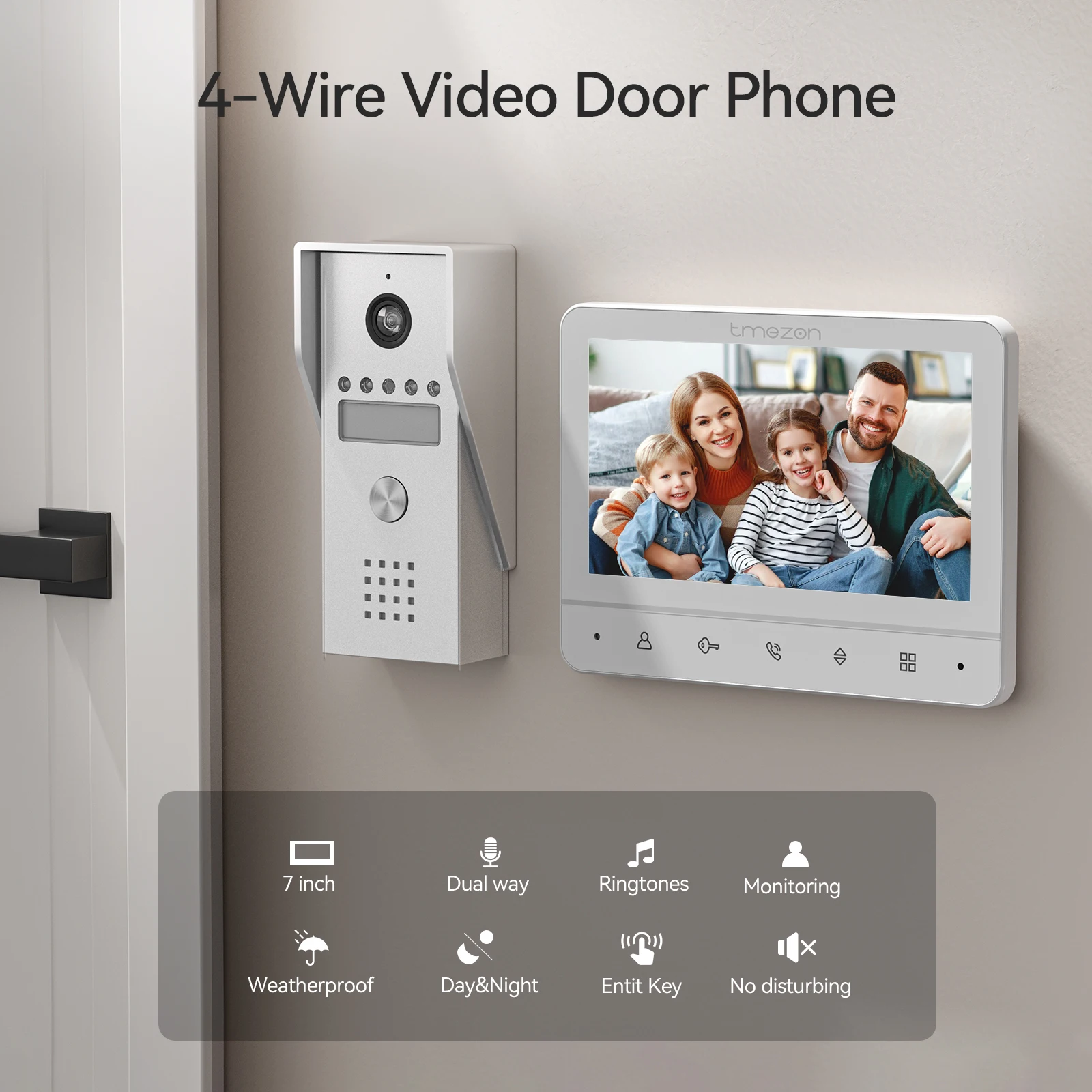 【TMEZON Interphone vidéo à 4 fils】 Moniteur d'intérieur LCD couleur de 7 pouces avec système d'exploitation léger, design fin et bouton tactile à la mode. Sonnette extérieure avec caméra, grand angle de vision de 120 degrés, haute définition, vision nocturne, conception anti-pluie et anti-vandalisme. La sonnette peut connecter toute la serrure électronique.