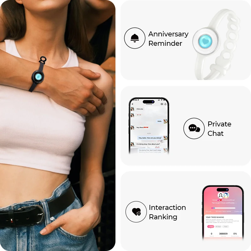 Totwoo offre une occasion étonnante pour exprimer votre amour à tout moment et en tout lieu.Après avoir connecté Totwoo à votre application Totwoo via Bluetooth, touchez simplement votre bracelet et le bracelet de votre partenaire s'allumera et vibrera, indiquant que vous en pensez, peu importe qu'ils soient dans la pièce ou dans le monde.