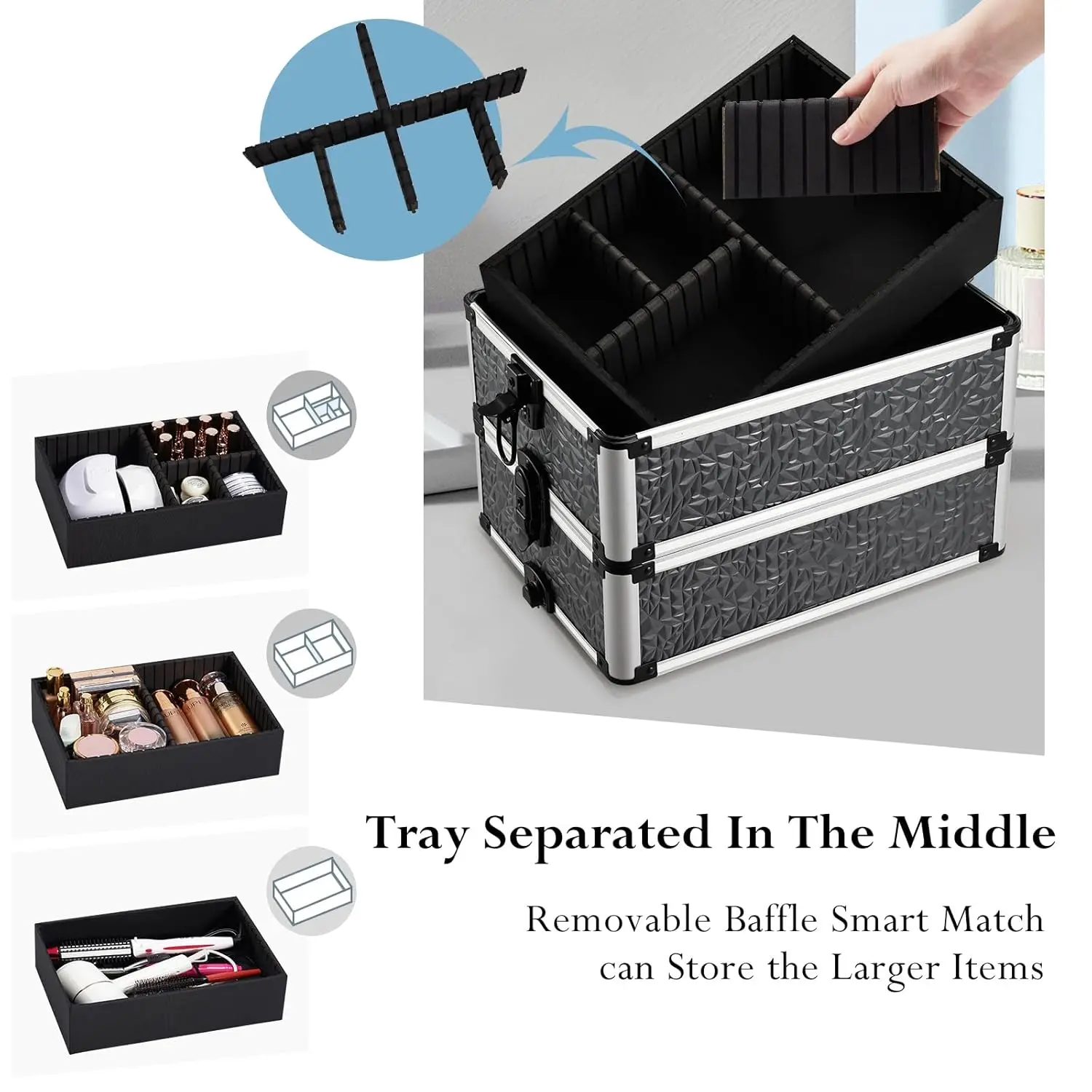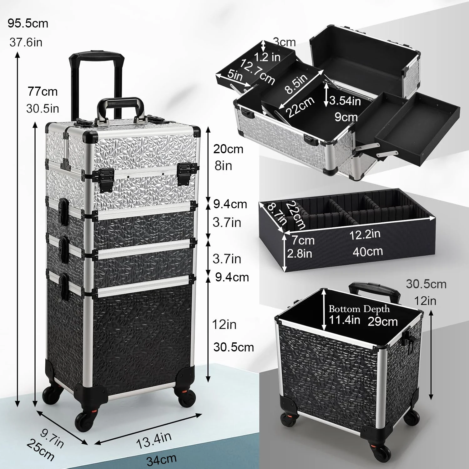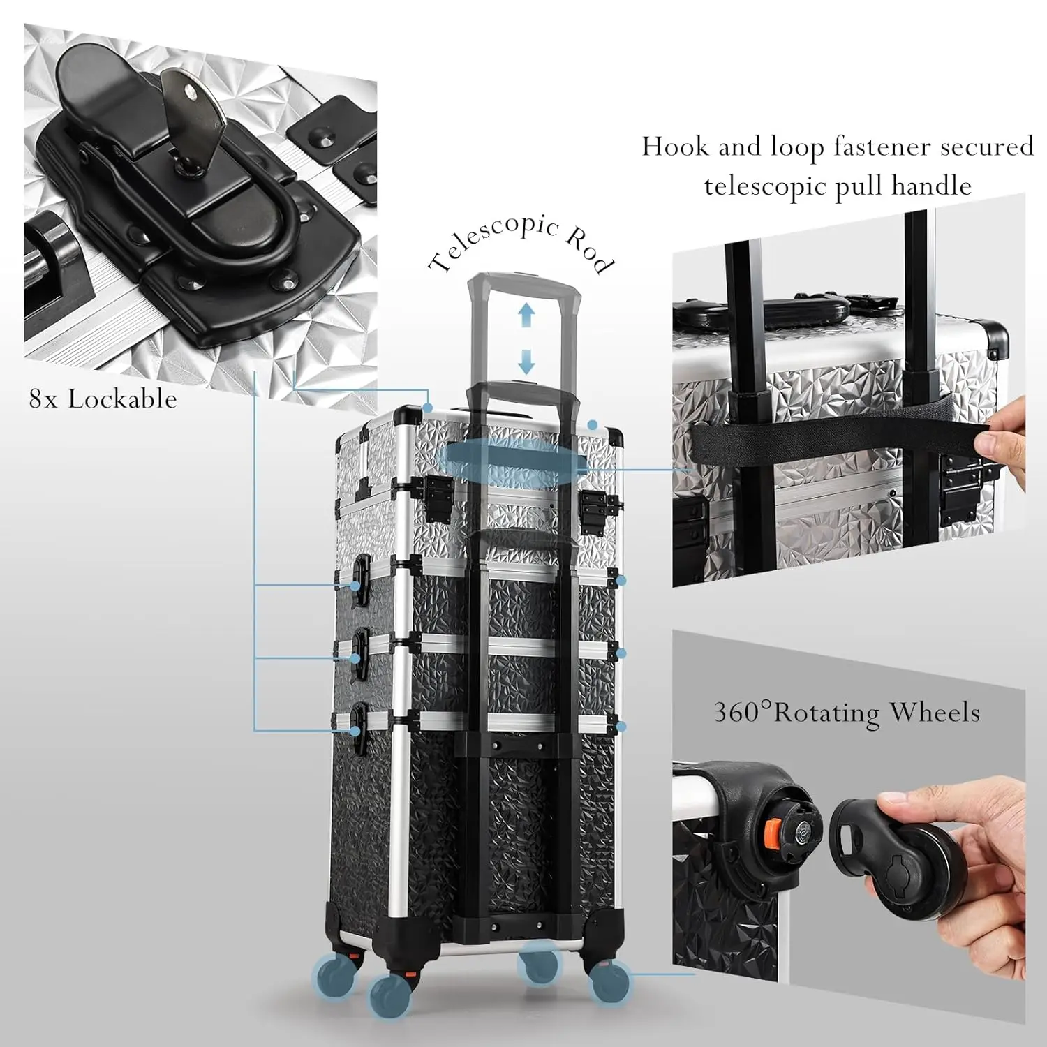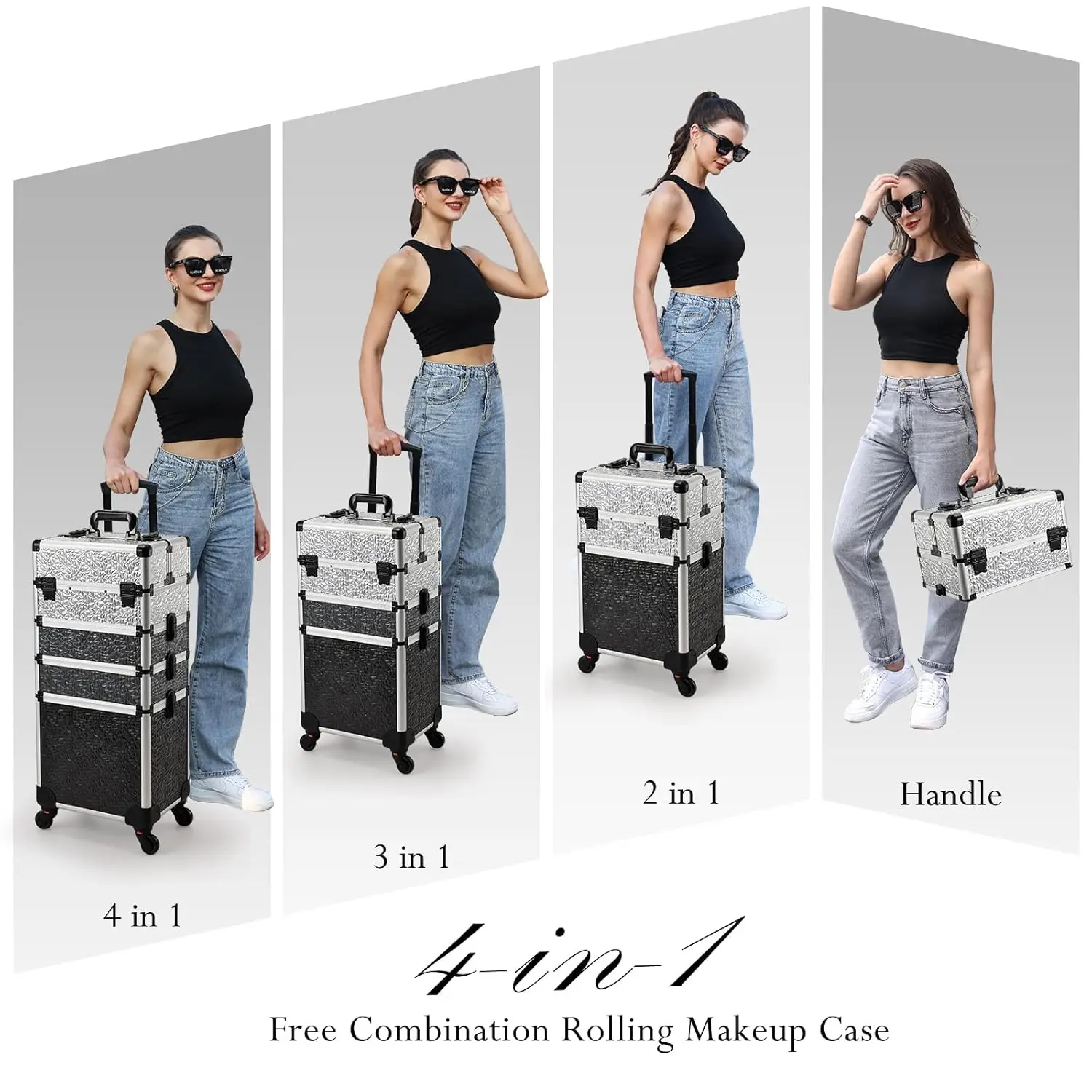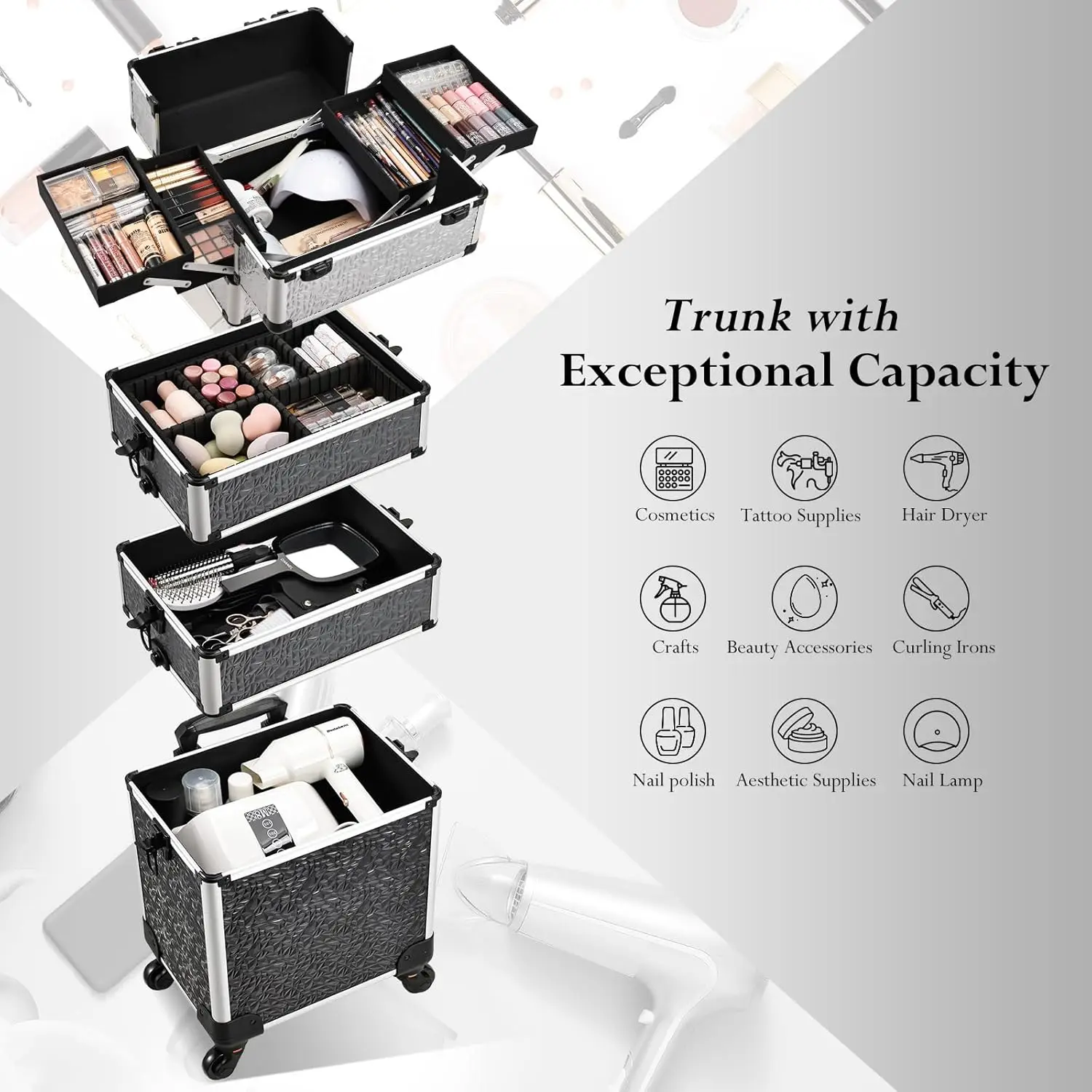 Trolley de Maquillage Professionnel Grand Format 4-en-1 sur Roues avec Clés, Valise de Voyage pour Cosmétiques et Ongles