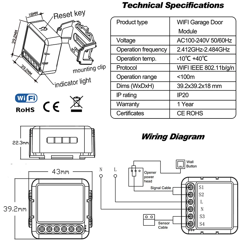 SPCIFICATION Type de produit : module de porte de garage WiFi. Tension nominale : AC100-240 V 50/6 OHz Fréquence WiFi : 2,412 GHz-2,484 GHz Norme WiFi : IEEE 802.11b/gyn Température de fonctionnement : -10℃-+40℃ Portée de fonctionnement : < 100 m Jantes : 39,2 mm*39,2 mm*18 mm Caractéristiques : 1) Télécommande APP : contrôlez à distance l'ouvre-porte de garage quand et o que vous soyez.Il suffit de contrôler la porte de garage avec l'application Smart Life/Tuya Smart lorsque vous êtes dans la voiture ou avant de sortir, pas besoin d'appuyer à nouveau sur l'interrupteur, ce qui rend votre vie plus intelligente et plus pratique. 2) Commande vocale : il suffit de simples commandes vocales, vous pouvez contrôler vocalement le module de porte de garage via Amazon Alexa ou Google Home Assistant, profitant ainsi d'une vie mains libres intelligente. 3) Programme de minuterie : une minuterie appropriée peut être réglée pour déclencher l'ouverture/fermeture de la porte de garage en fonction de vos besoins pour sortir ou rentrer à la maison, créant vous-même une vie plus intelligente avec l'ouvre-porte de garage intelligent. 4) Notification de sécurité en temps réel : ne vous inquiétez jamais si la porte de garage se ferme ou non. S'il y a un état anormal de la porte de garage, elle alertera dans l'application, créant une vie plus sûre et plus intelligente. 5) Enregistrement de l'historique : ne vous inquiétez pas si la porte de garage est fermée ou non, vous pouvez vérifier l'historique dans l'application Smart Life. 6) Fonction de partage : partagez les autorisations de fonctionnement du module de porte de garage intelligent avec votre famille, profitant ainsi d'une vie intelligente et pratique ensemble. Remarque : 1. Veuillez vous assurer qu'il y a un interrupteur externe avec votre porte de garage, sinon le module de commutation ne pourra pas être installé. Si la porte de garage peut être contrôlée par un interrupteur et un contrôleur externes, vous pouvez également installer le module. 2. Le module de porte de garage intelligent ne peut pas être mis en pause dans l'application. 3. Veuillez d'abord calibrer le module de porte de garage. Choisissez une heure appropriée pour l'ouverture/la fermeture.