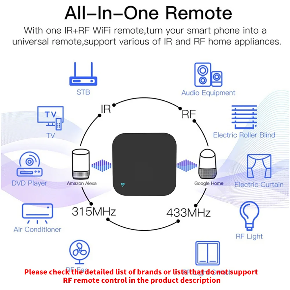 La bibliothèque de codes IR étendue Smart IR Remote couvre plus de 98 % des appareils IR.Donc TV, climatiseur, ventilateur STB et éclairage, etc.qui utilise le contrôle IR peut être contrôlé par celui-ci. Et des appareils compatibles RF tels que le rideau, le volet roulant, la porte de garage, le commutateur RF peuvent être contrôlés par celui-ci.