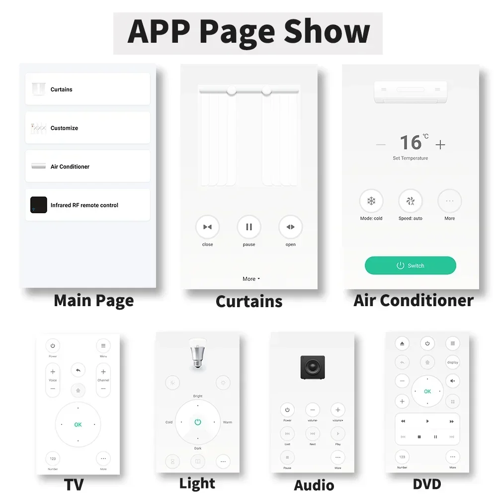 Prise en charge de la copie et de la répétition RF.Il peut donc prendre en charge les rideaux, le volet roulant, le poussoir de fenêtre, le support, l'écran de projection, la porte de garage, la porte rétractable, l'interrupteur RF et même les boutons personnalisés.