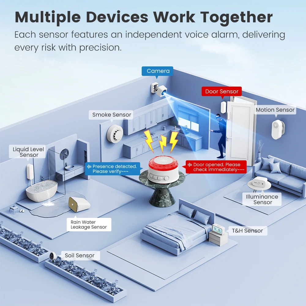 Fonctionne avec 24 types de capteurs intelligents tels que le capteur de porte, le capteur de caméra, le capteur de fuite d'eau,
