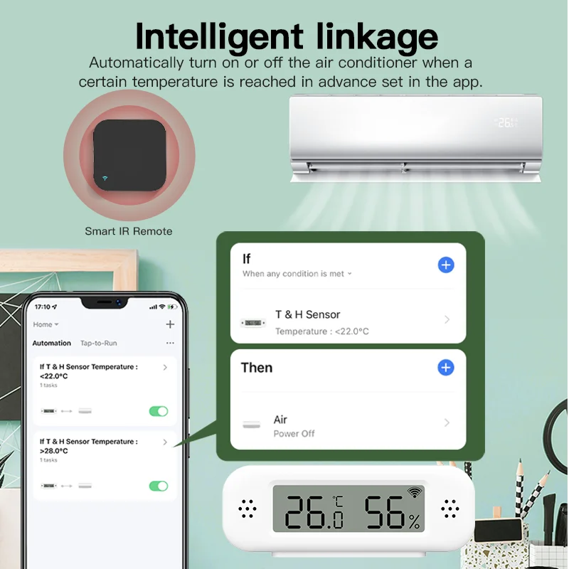 La surveillance de haute précision et en temps réel vous aide à réaliser différentes stratégies de liaison.Par exemple, si la température atteint 32,6 degrés Celsius, allumez le climatiseur via notre télécommande universelle.Ou allumez l'humidificateur lorsque l'humidité est inférieure à une certaine valeur.