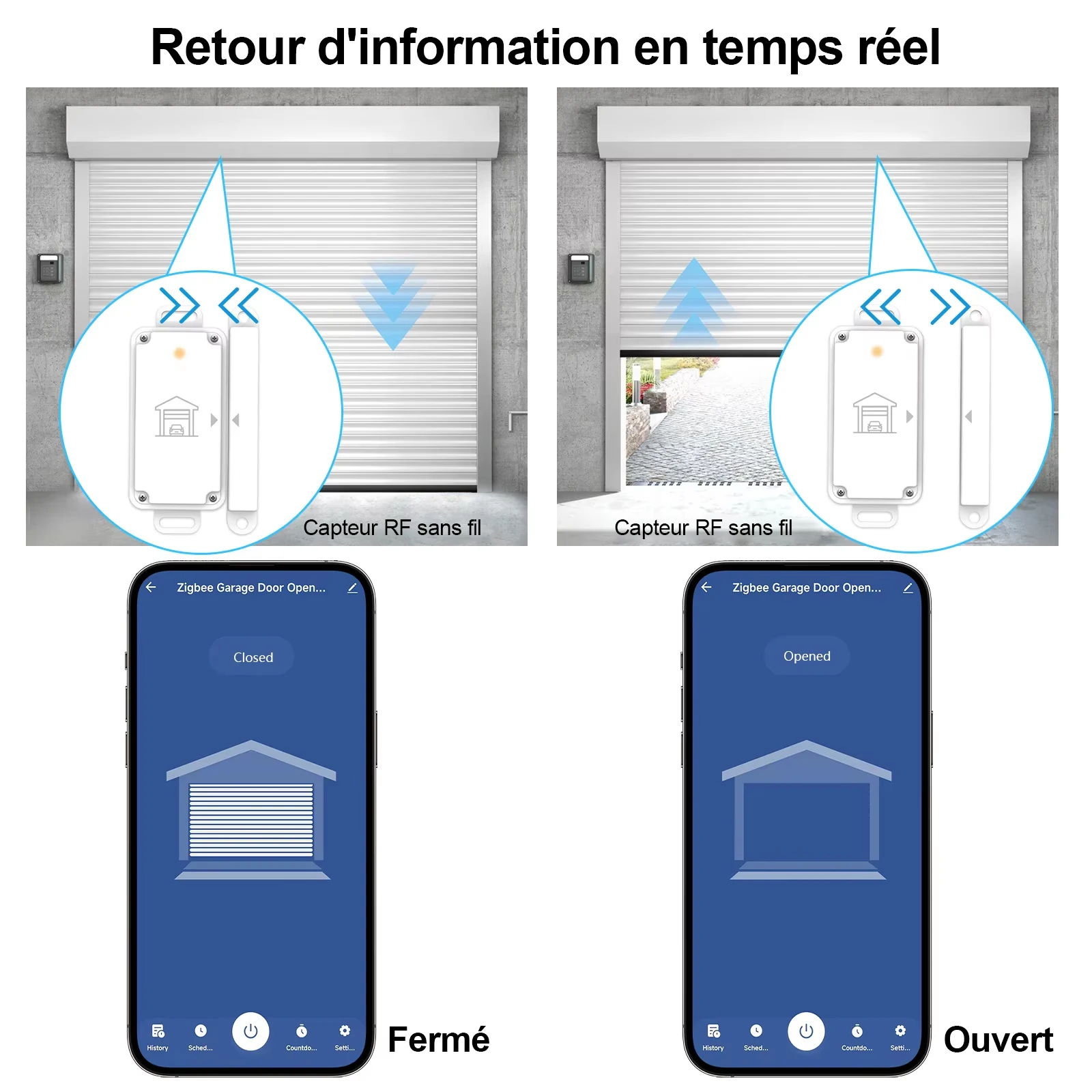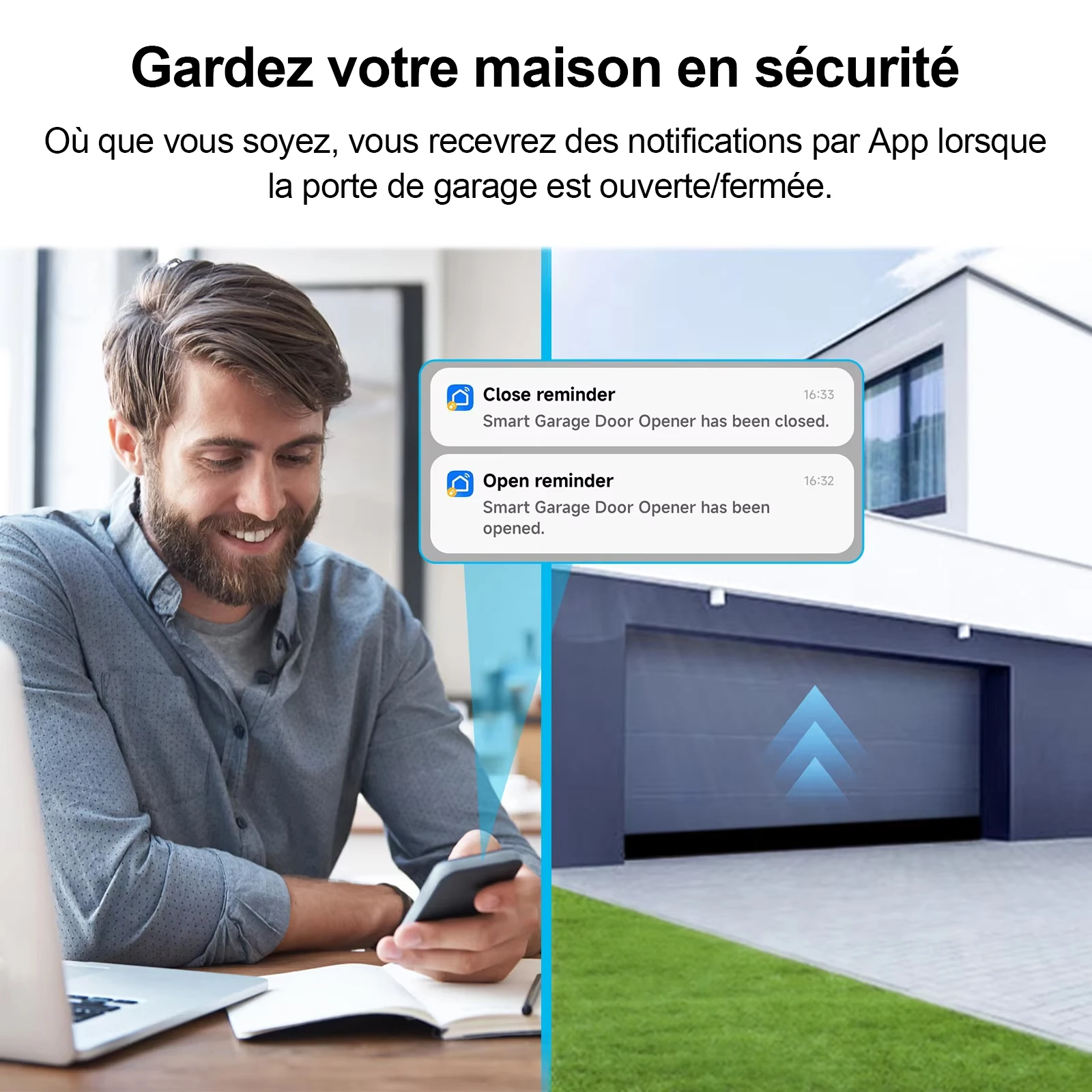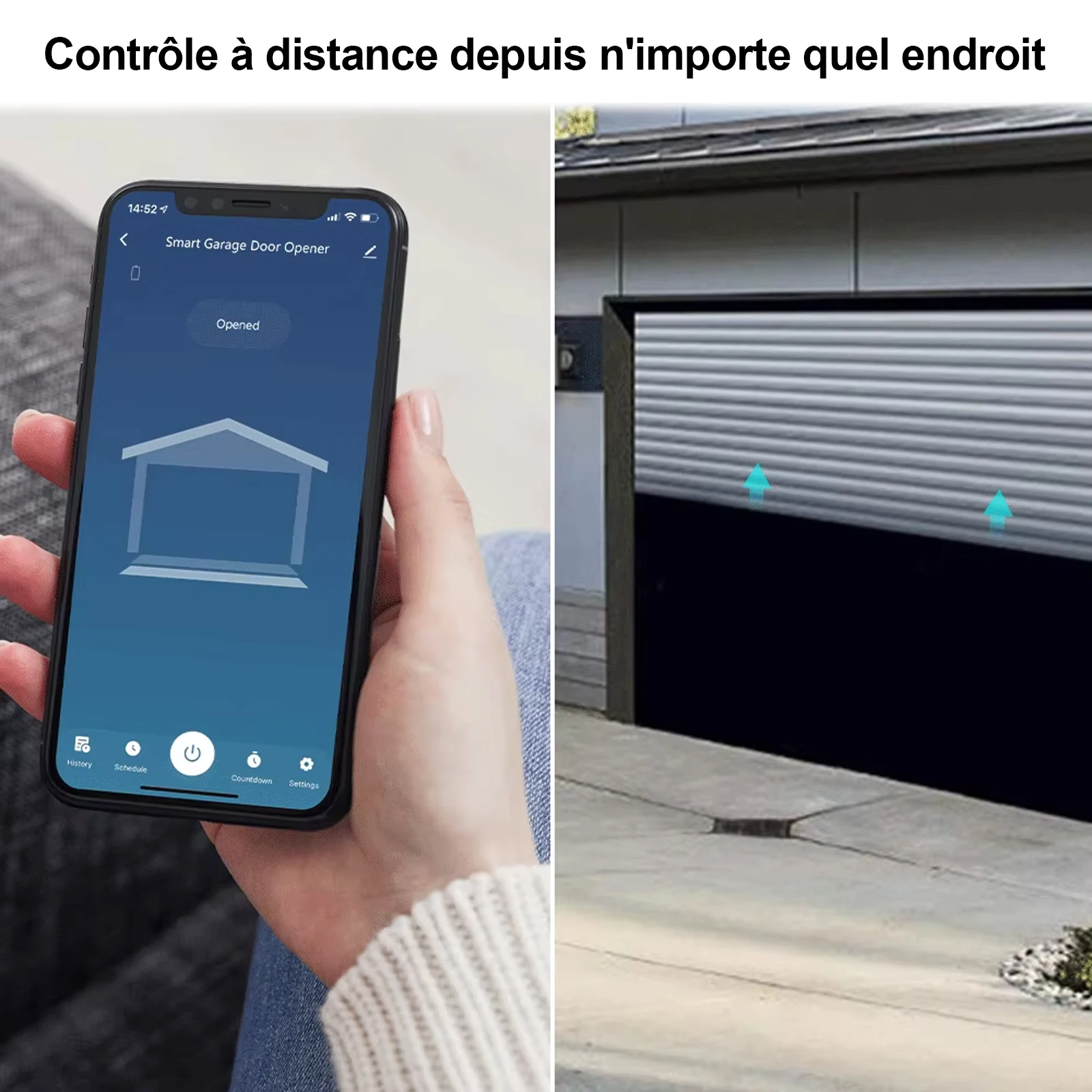 - L'interface App fournit des informations en temps réel sur l'état de la porte de garage pour confirmer la sécurité de la maison.